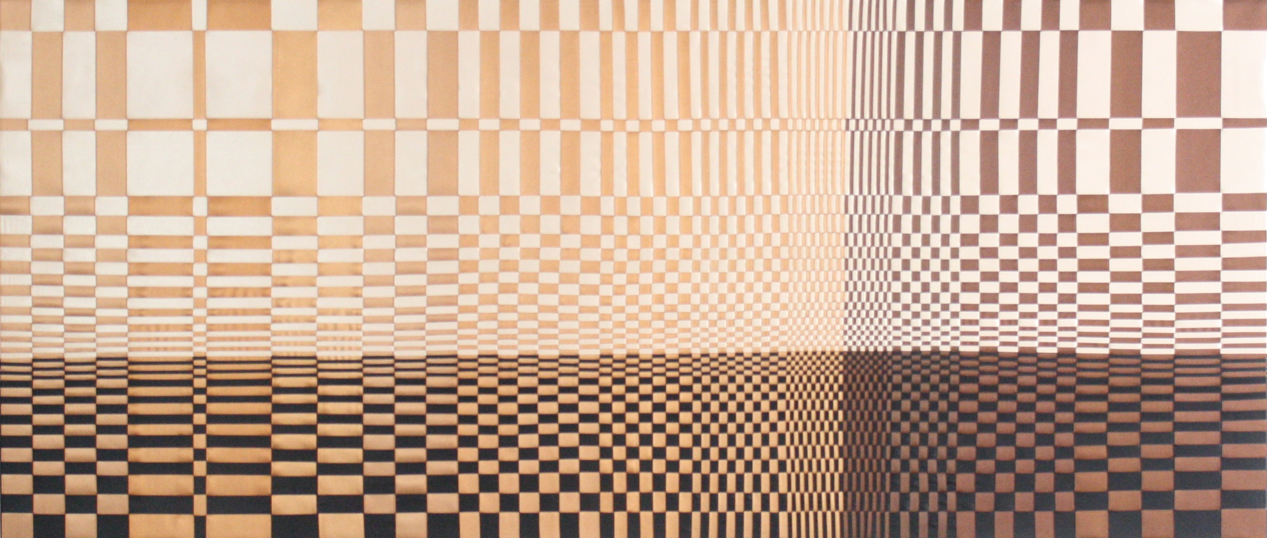 Weefwerk gemaakt met 4 kleuren satijnlint (zwart, bruin, ecru en roest), twee horizontaal en twee verticaal, gespannen op een houten frame van 100 x 43 cm. Het werk kan zowel horizontaal als verticaal opgehangen worden (twee ophangsystemen, bruin komt dan onder, roest boven). Door de lichtval verandert het werk als je er langs loopt maar ook gedurende de dag. Het werk heeft geen lijst nodig, de zijkant is afgewerkt met lint.
