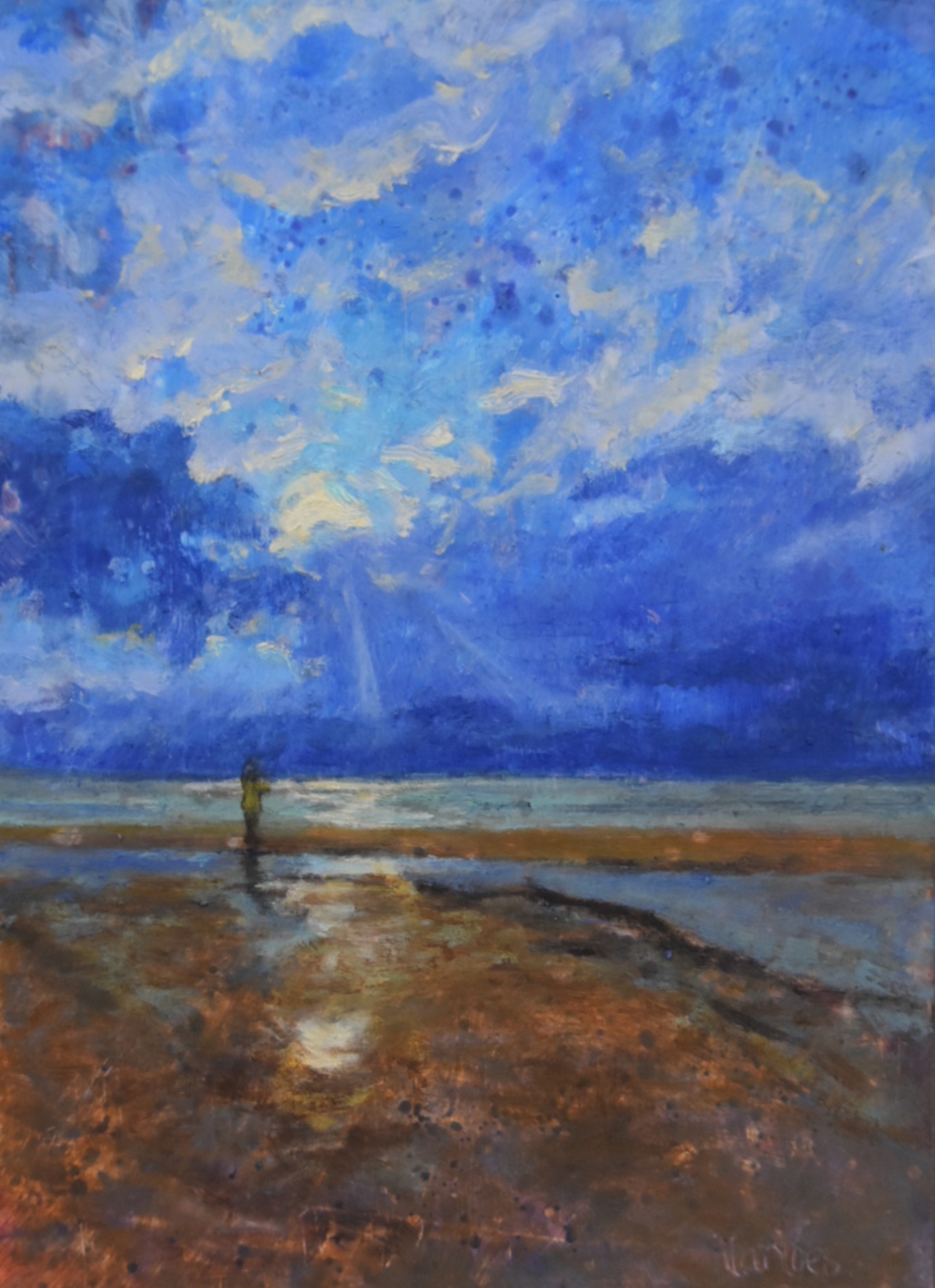 Strand, zee, water, licht, wolken..... Olieverf op muspaneel, 13 x 18.