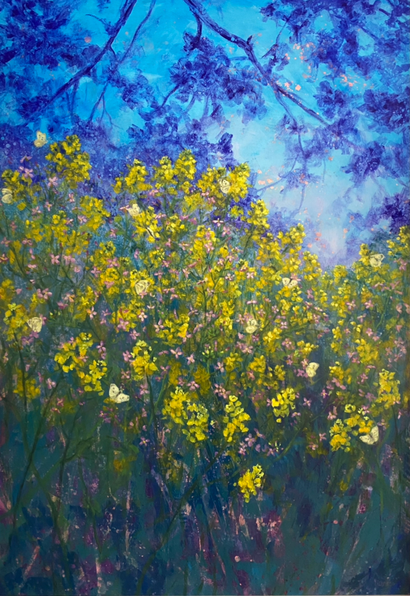 Schilderij Geel Blauw Olieverf Vlinders Koolzaadveld Koolwitje Transformatie Dertien Marloes Buigel Boering