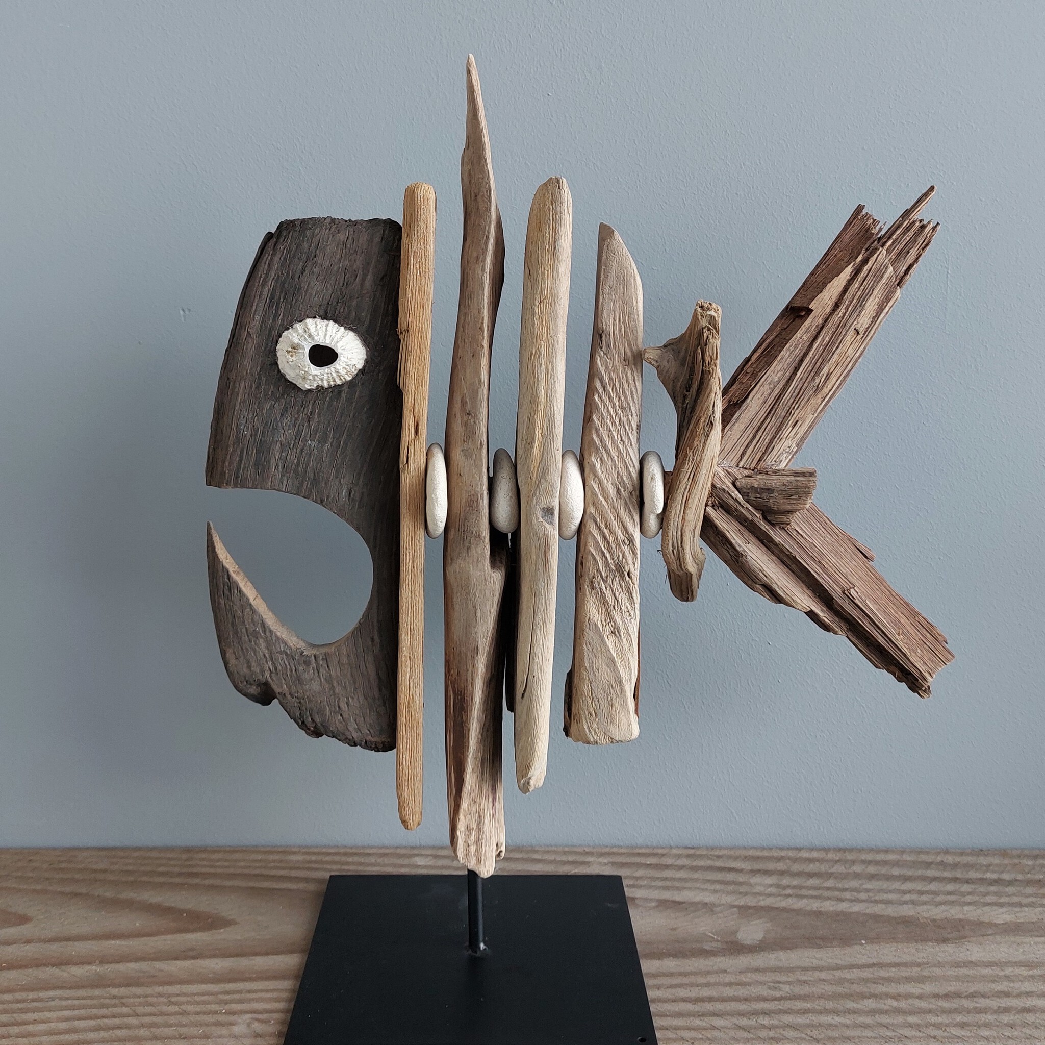 maakt al jaren houten beelden door natuurlijke objecten uit zee te koppelen. De beelden zijn ruw en puur.