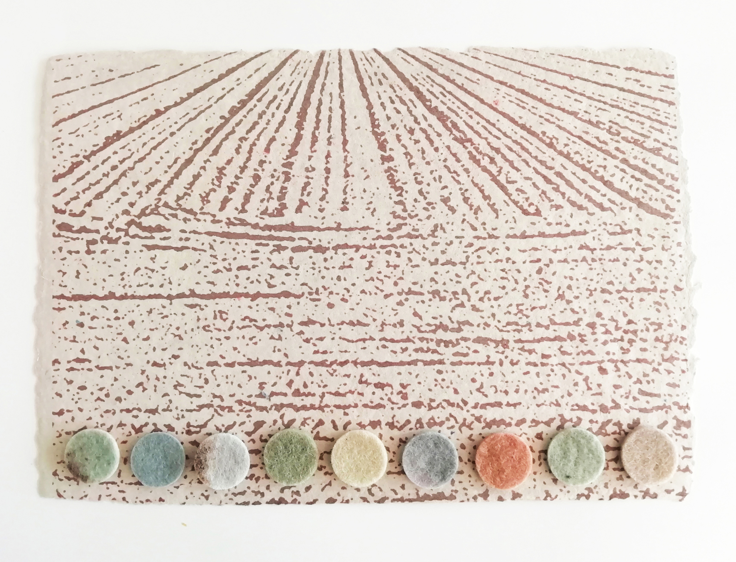 Stilte, weids, aarde. Jose van Loon, vilten toevoegingen. Lia Stouten, handgeschept papier en vlakdruk.