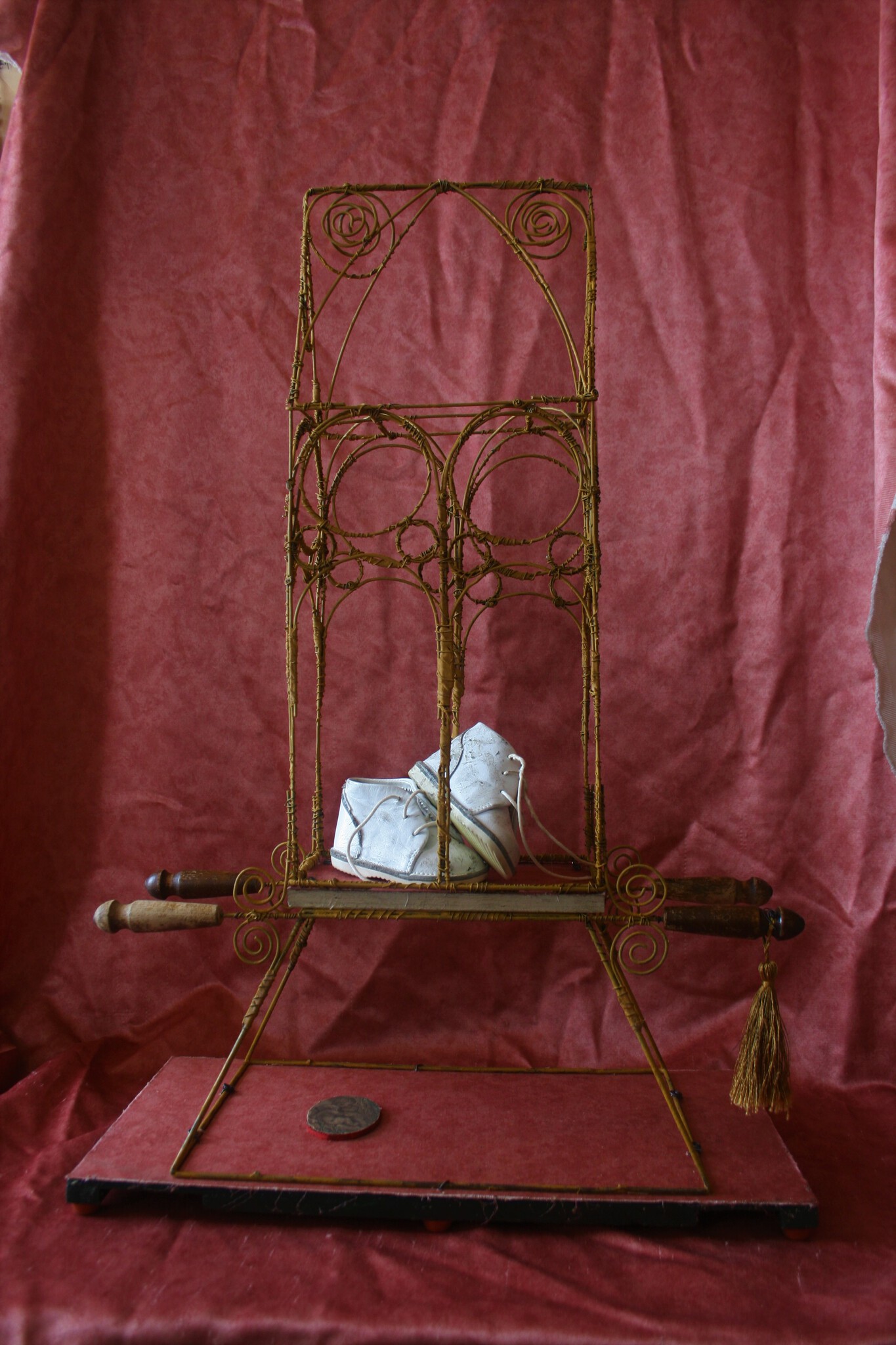 fragment, ijzerdraad, hout, textiel, acrylverf