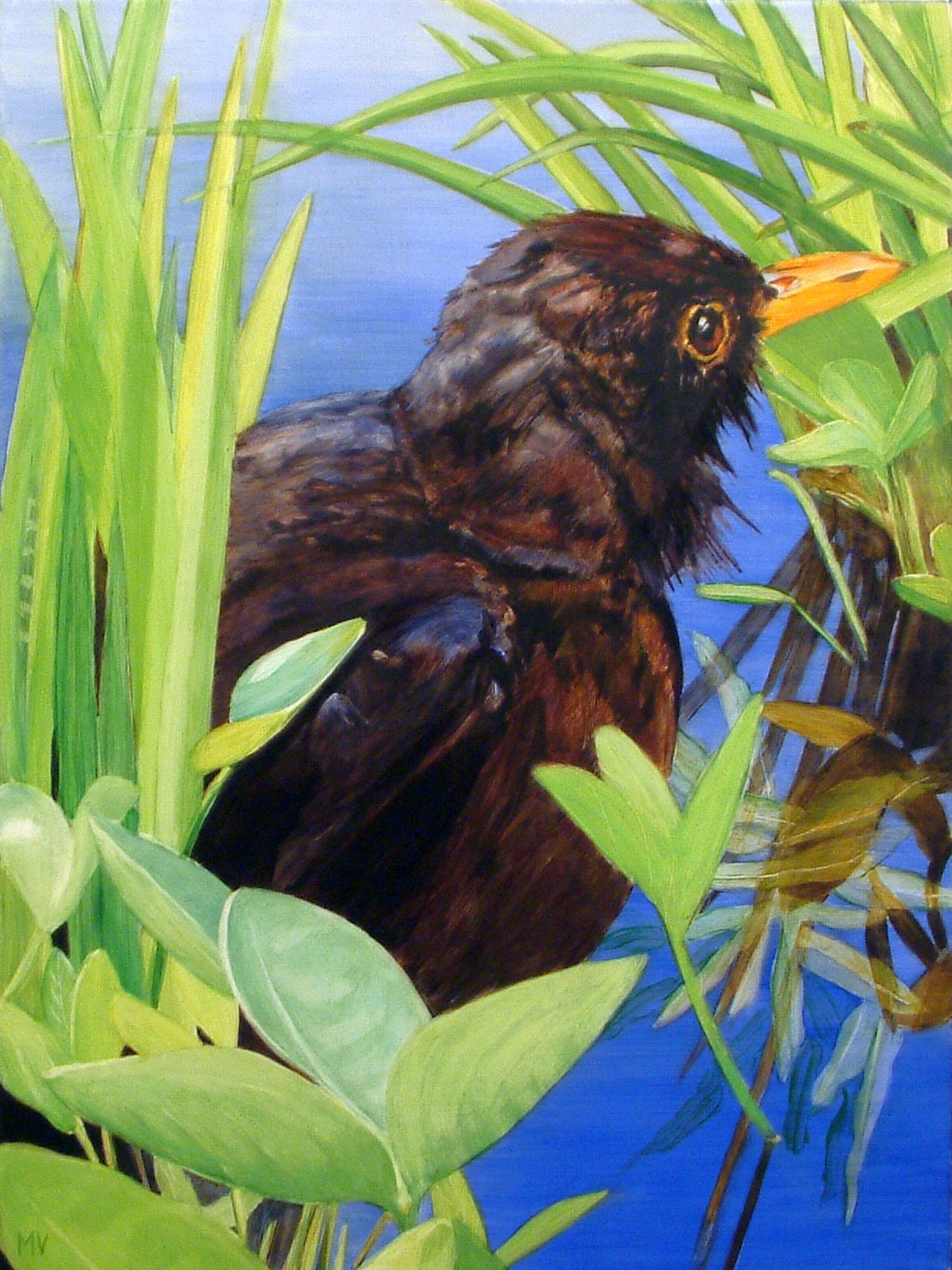 Zwart Blauw Vogel Blue Water Dier Realistisch Olieverf Oilpaint Bird Animal Realistic Merel Blackbird