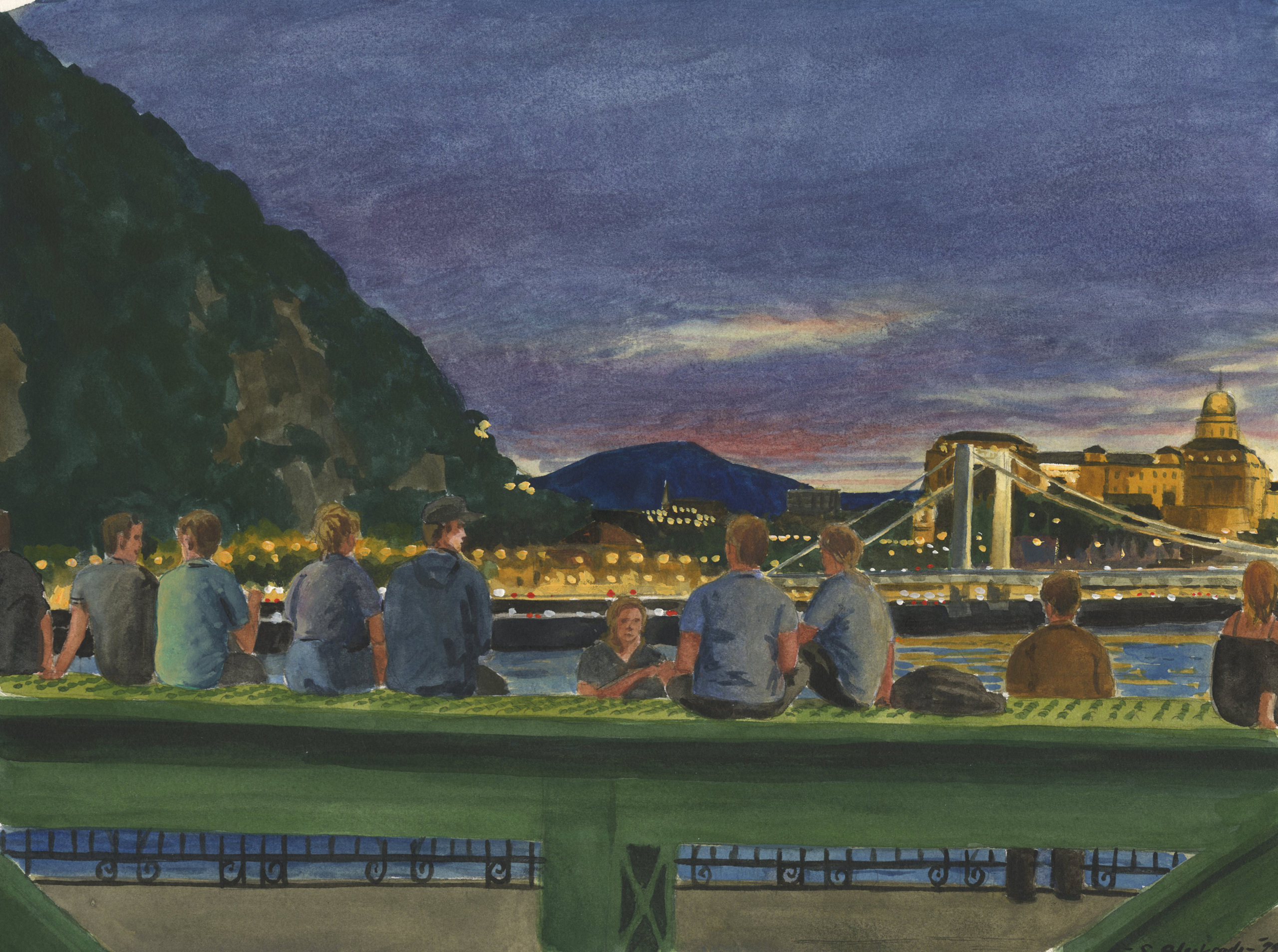 Schilderij Mensen Art Aquarel Kunst Painting Realisme Realism Watercolor Stad People City Hongarije Hungary Boedapest Budapest