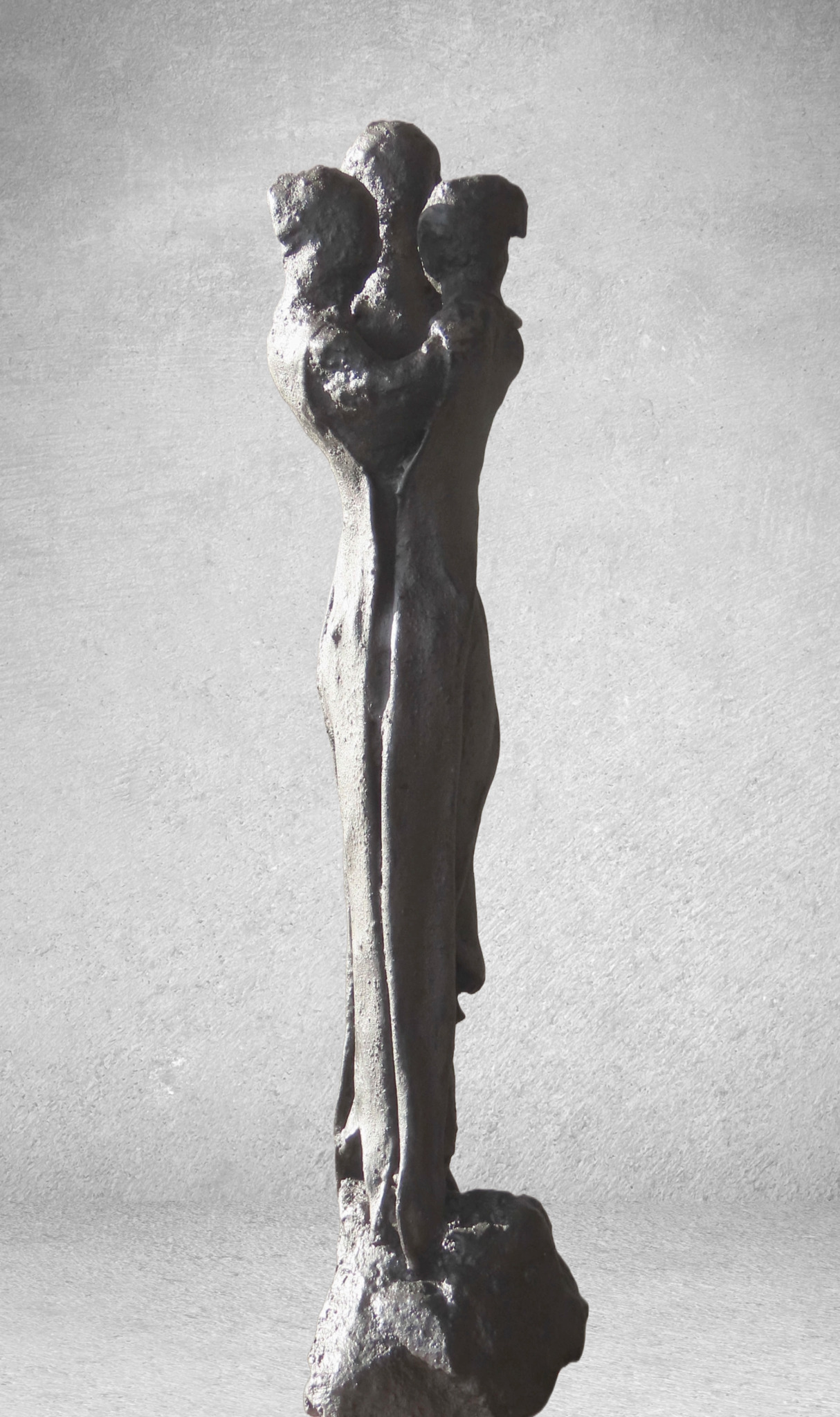 - VERKOCHT - Werk in opdracht. Beeld van klei, afgewerkt met textiel en paverpol. Het beeld geeft de band tussen drie zussen weer. Ieder heel verschillend, maar toch in alles verbonden...