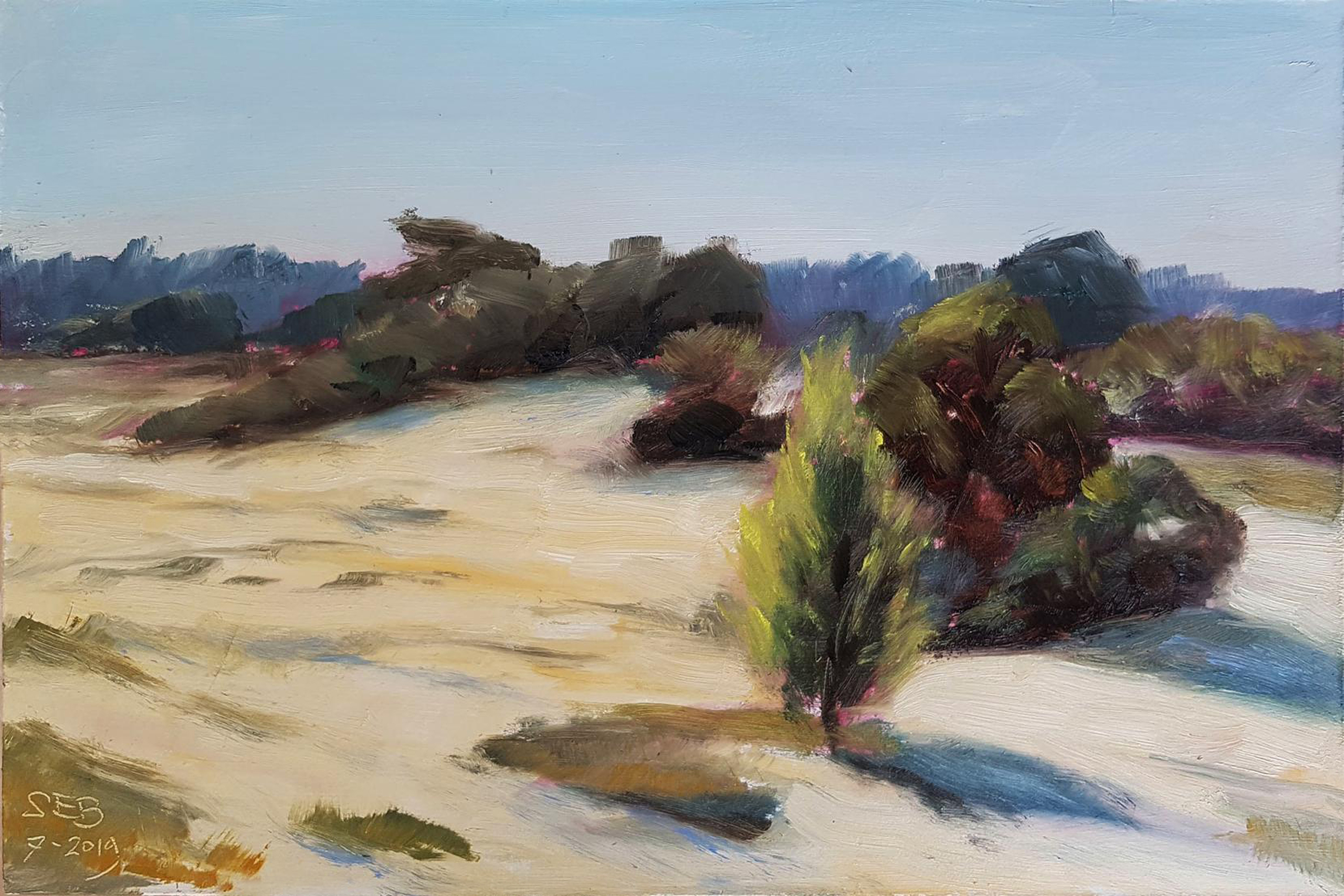 Een olieverflandschap op hardboard, 20 x 31 cm. En plein air geschilderd op het Kootwijkerzand, nabij de uitkijktoren. Geschilderd in de vroege ochtend van donderdag 25 juli 2019. Voorzien van een ophangsysteem en zwarthouten lijst.