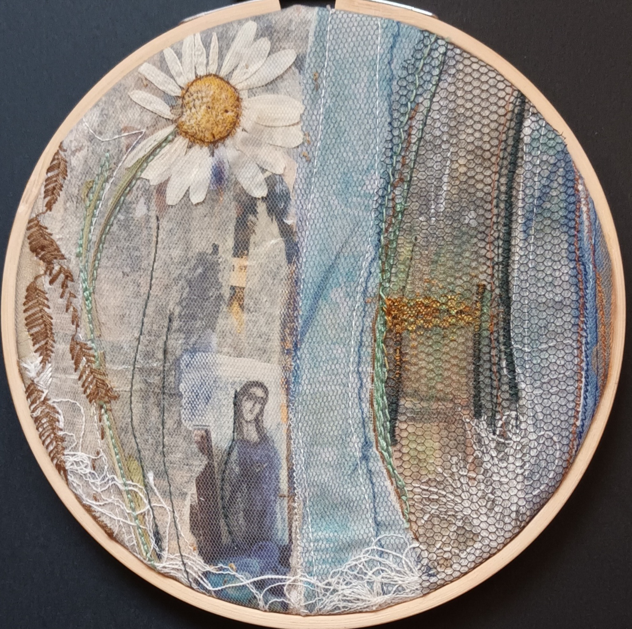Compositie van kleuren en vormen gemaakt van tekeningen bewerkt met garens en textiel. Droogbloemen