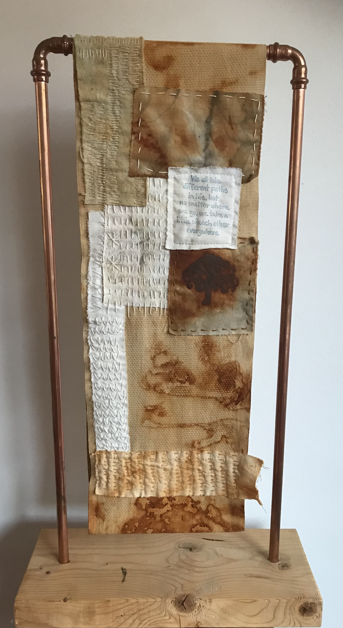 Na mijn borstkankeroperatie in 2019 was mijn creatieve brein op non actief.Het enige waar ik toe in staat was was voor de voet weg borduren. Ik had eerder al een partij handdoekrollen gekocht die in automaten hangen. Daarvan heb ik 10 meter geborduurd en die 10 meter heb ik verknipt tot 5 stukken. Daarvoor is een standaard gemaakt van koperen waterleidingbuizen waar het werk over hangt en dus net als vroeger in hun functie van handdoek kunnen rollen. Op die manier kun je steeds een ander stuk voor draaien. Het werk is aan beide zijden mooi.