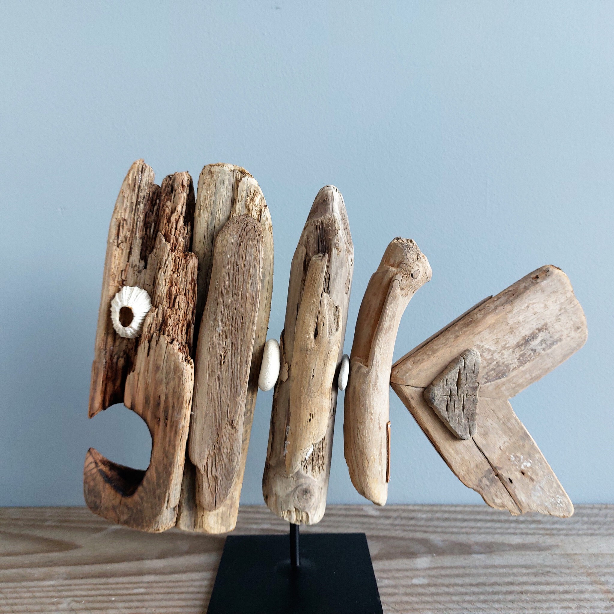 maakt al jaren houten beelden door natuurlijke objecten uit zee te koppelen. De beelden zijn ruw en puur.