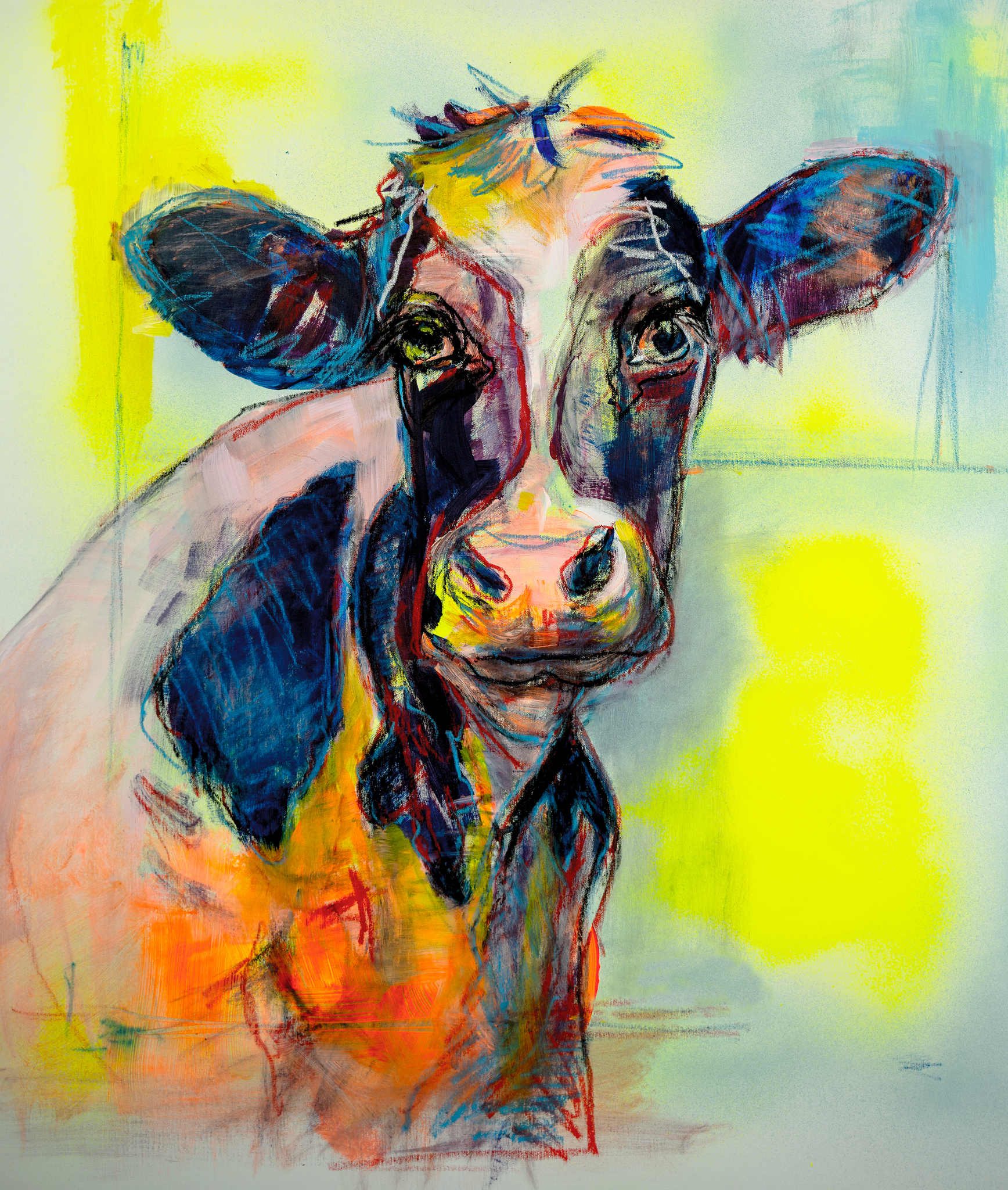 Een vrolijk, spontaan, portret van een bonte Friese koe, geschilderd met geel, oranje en blauwe kleuren. Dit schilderij is in opdracht geschilderd