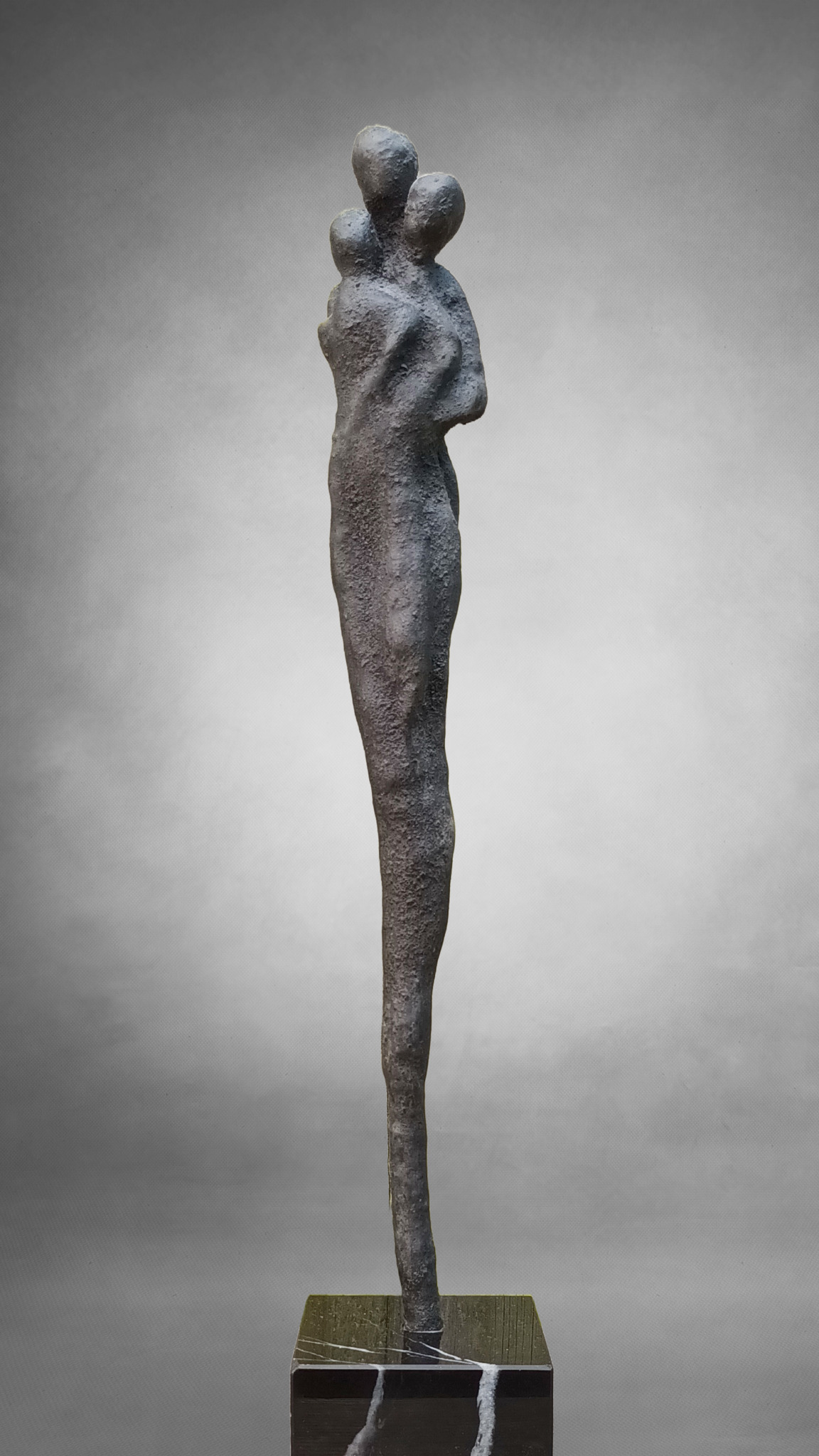 De verbinding is onzichtbaar, maar altijd aanwezig. Beeld in klei, afgewerkt met paverpol en paversand, inclusief zwart marmeren sokkel van 7,5x7,5x3 cm.