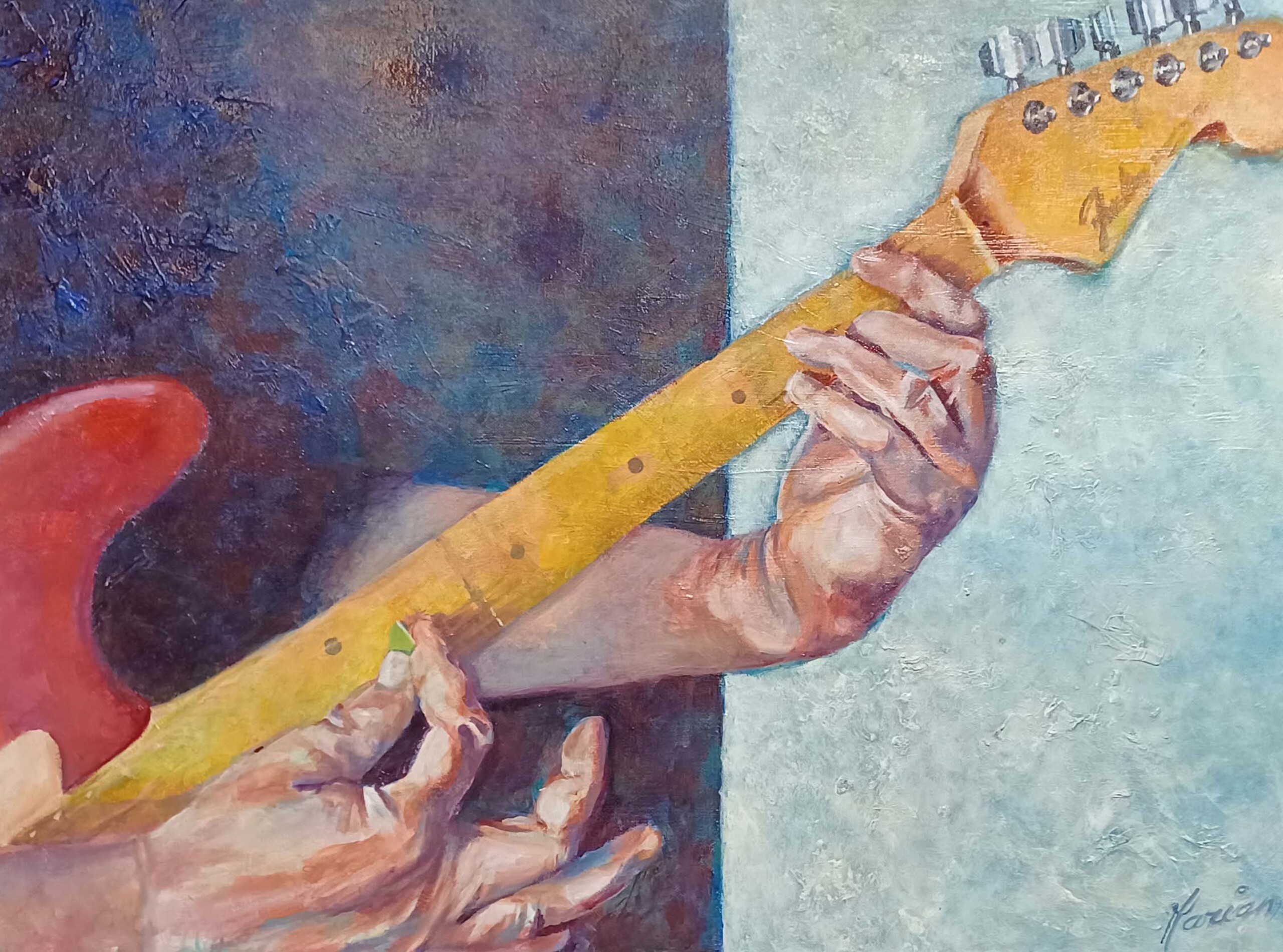 Blauw Acryl Realistisch Boer Handen De Muziek Gitaar Kunstschilder Muziekinstrument Marianne