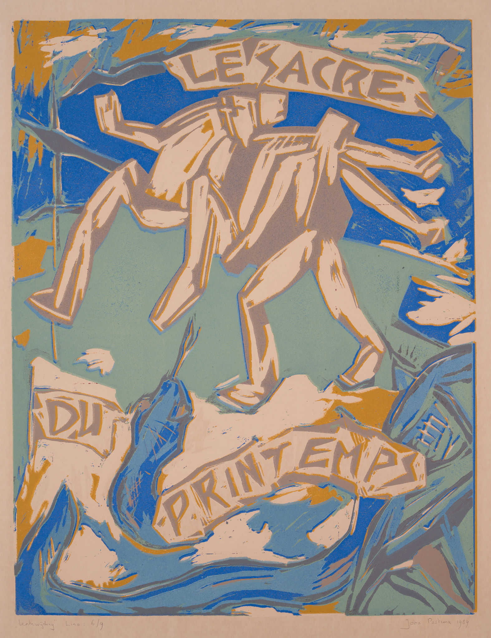 Linosnede oplage 1-9, alle exemplaren verschillen licht van elkaar. Papierformaat: 80x64, Beeldformaat 65x50 Dit werk is geinspireerd op het werk: Le Sacre du Printemps van Igor Strawinsky uit 1913. Bij de wat hoekige vormgeving heb ik me ook laten inspireren door de beeldende kunst uit die periode.