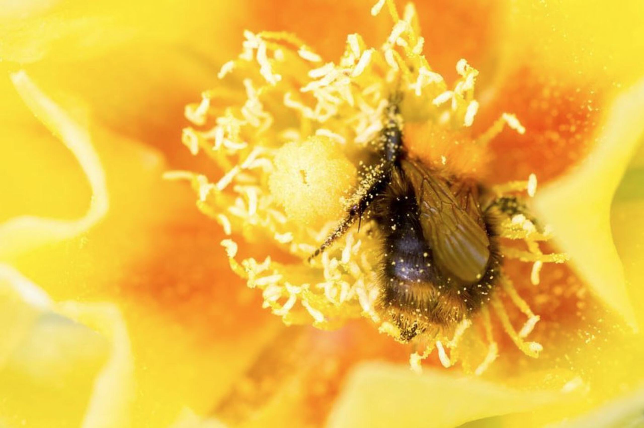 Gravend naar gouden nectar is dit bijtje betrapt. En zonder het te weten helpt hij óns ook aan voedsel. Het harde werkertje bestuift onze wereld. Een goudgele wereld waarin je je net als dit diertje onderdompelt. Het werk kan als print geleverd worden in vele formaten (incl. behang) en materialen. (zie qeimoy.com).