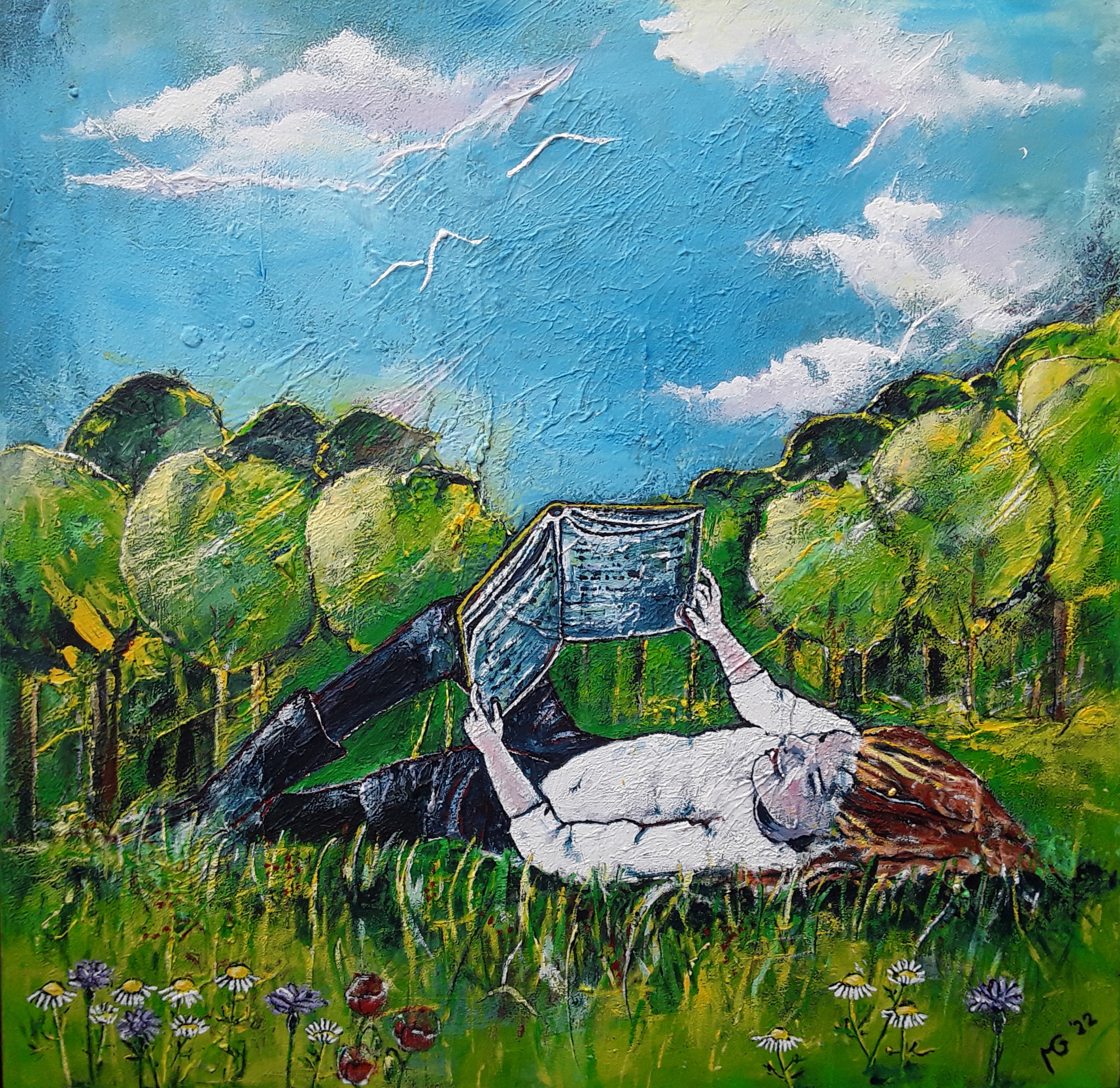 Margareth Groot (1960) Hoogwoud, Mensen, lange reizen door Azie, sfeer, kleuren, maar ook de omgeving om haar heen, inspireert haar tot het maken van vaak kleurige schilderijen. Spelen met kleuren, het liefst op grote doeken, met verfrollers, acrylverf, en (altijd voorhanden) de eigen vingers, wat meditatief kan werken. Soms laag over laag, wat verrassend relief kan brengen. De ene keer een doel voor ogen (b.v. meteen opdracht), maar vaak ontstaat er spontaan iets.