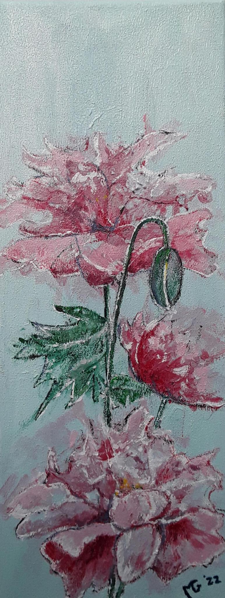 Margareth Groot (1960) Hoogwoud, Mensen, lange reizen door Azie, sfeer, kleuren, maar ook de omgeving om haar heen, inspireert haar tot het maken van vaak kleurige schilderijen. Spelen met kleuren, het liefst op grote doeken, met verfrollers, acrylverf, en (altijd voorhanden) de eigen vingers, wat meditatief kan werken. Soms laag over laag, wat verrassend relief kan brengen. De ene keer een doel voor ogen (b.v. meteen opdracht), maar vaak ontstaat er spontaan iets.