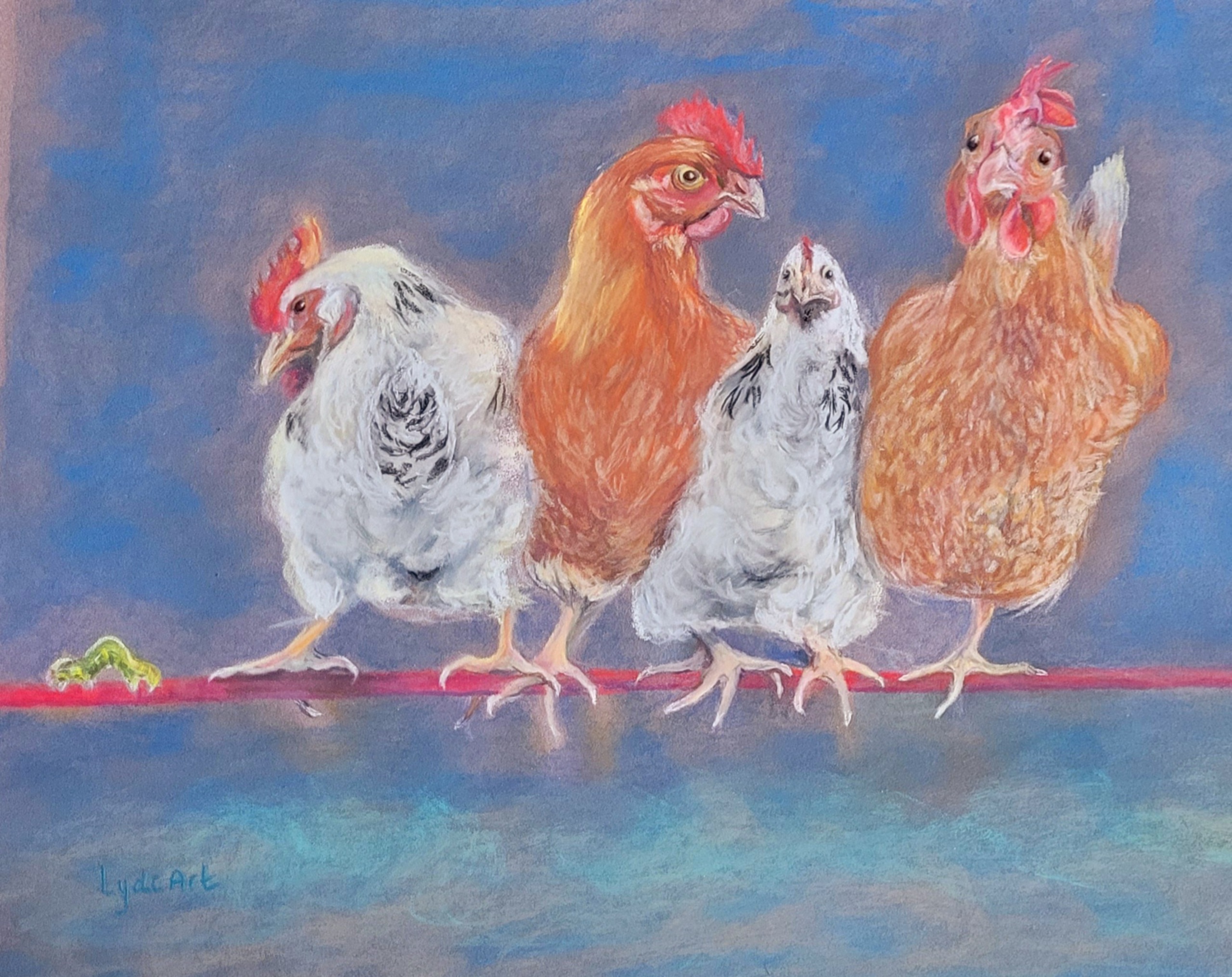 Een gezellig stel eigenwijze kippen in pastel getekend. Elke kip heeft zíjn eigen specifieke karakter.