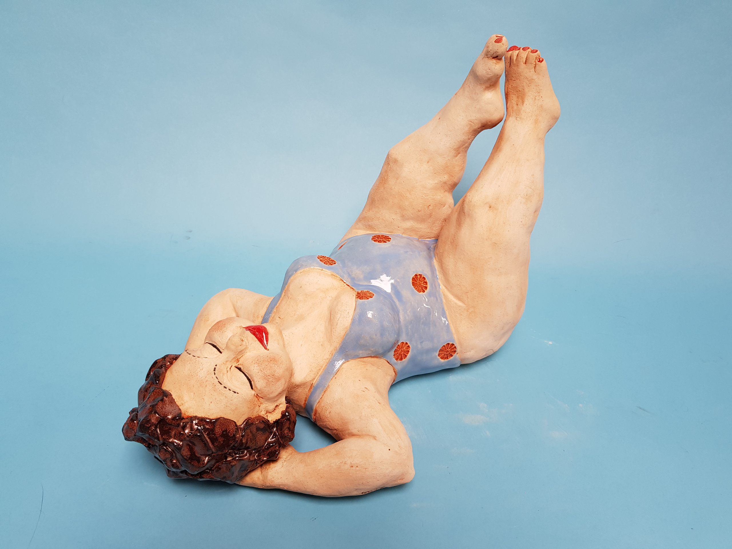 Liggende vrouw in blauw badpak, met de benen in de lucht. Keramiek afgewerkt met blauw glanzende en matte glazuur