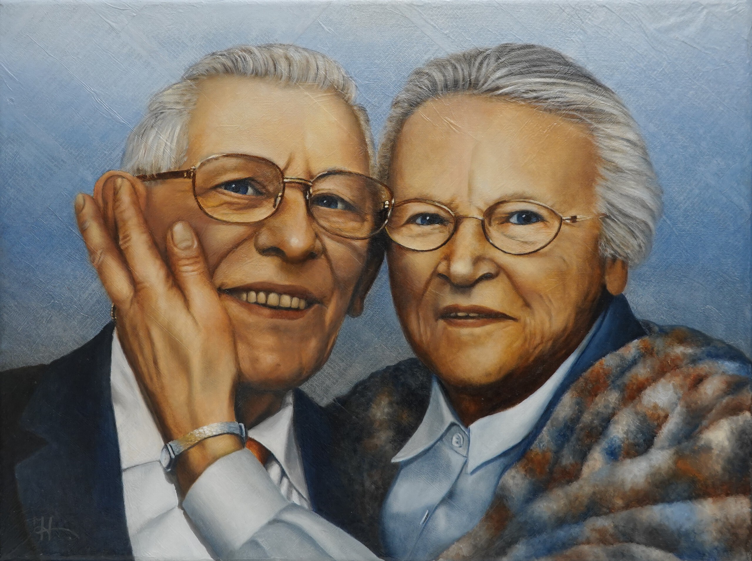 In opdracht geschilderd als herinnering aan een bijzonder paar. De lijfspreuk van de diepgelovige vrouw was: Het beste komt nog. Wat een hoop en vertrouwen sprak zij daarmee uit. De Bijbel was hun richtsnoer. Daarom heb ik ervoor gekozen om de achtergrond te maken van bladzijden uit een oud Bijbeltje.