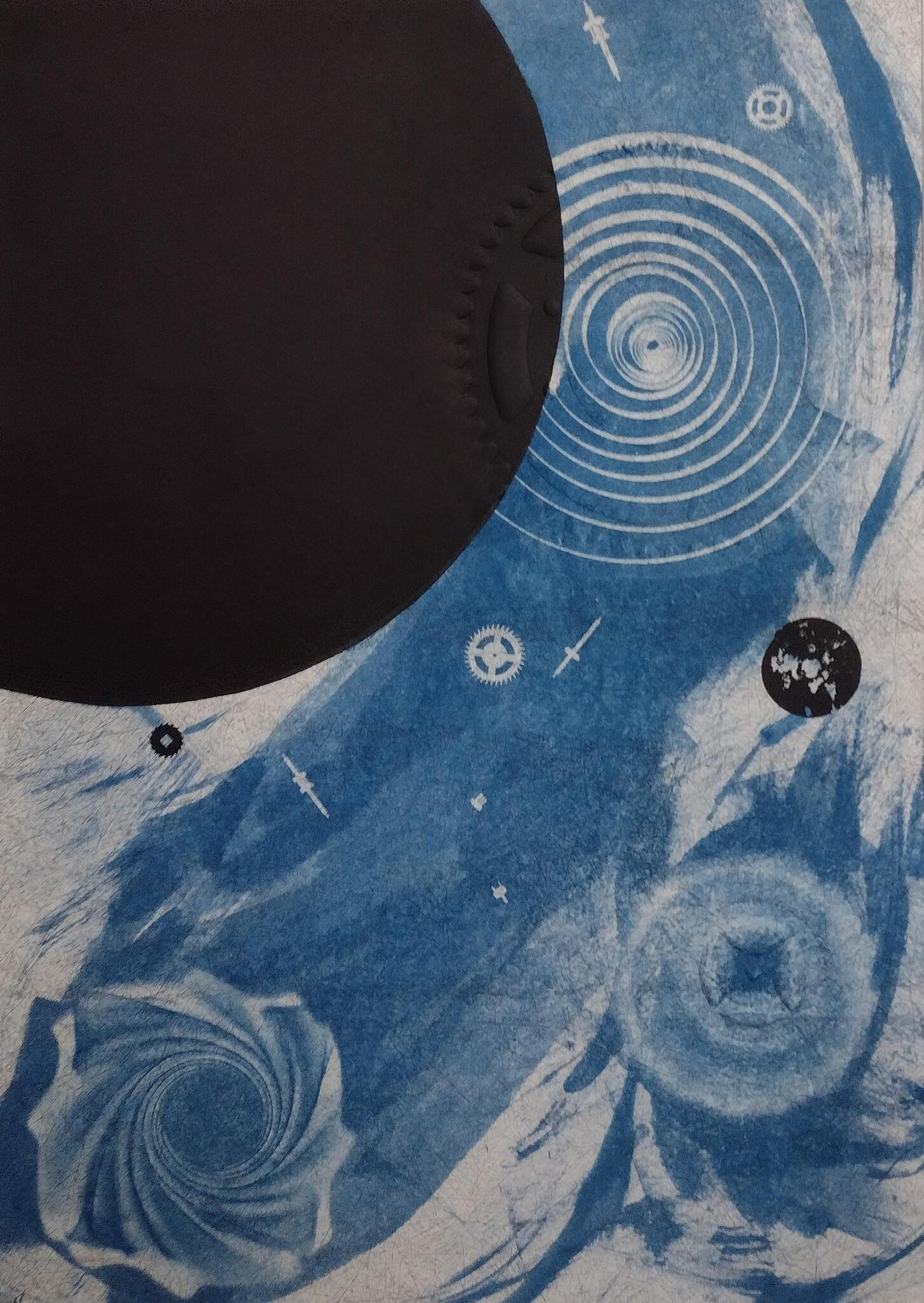 Kunstwerk gemaakt naar aanleiding van het gedicht "De kriekrode zonne" van Guido Gezelle. Technieken; Blauwdruk, Hoogdruk en Blinddruk. Kaderformaat 80x60 cm.