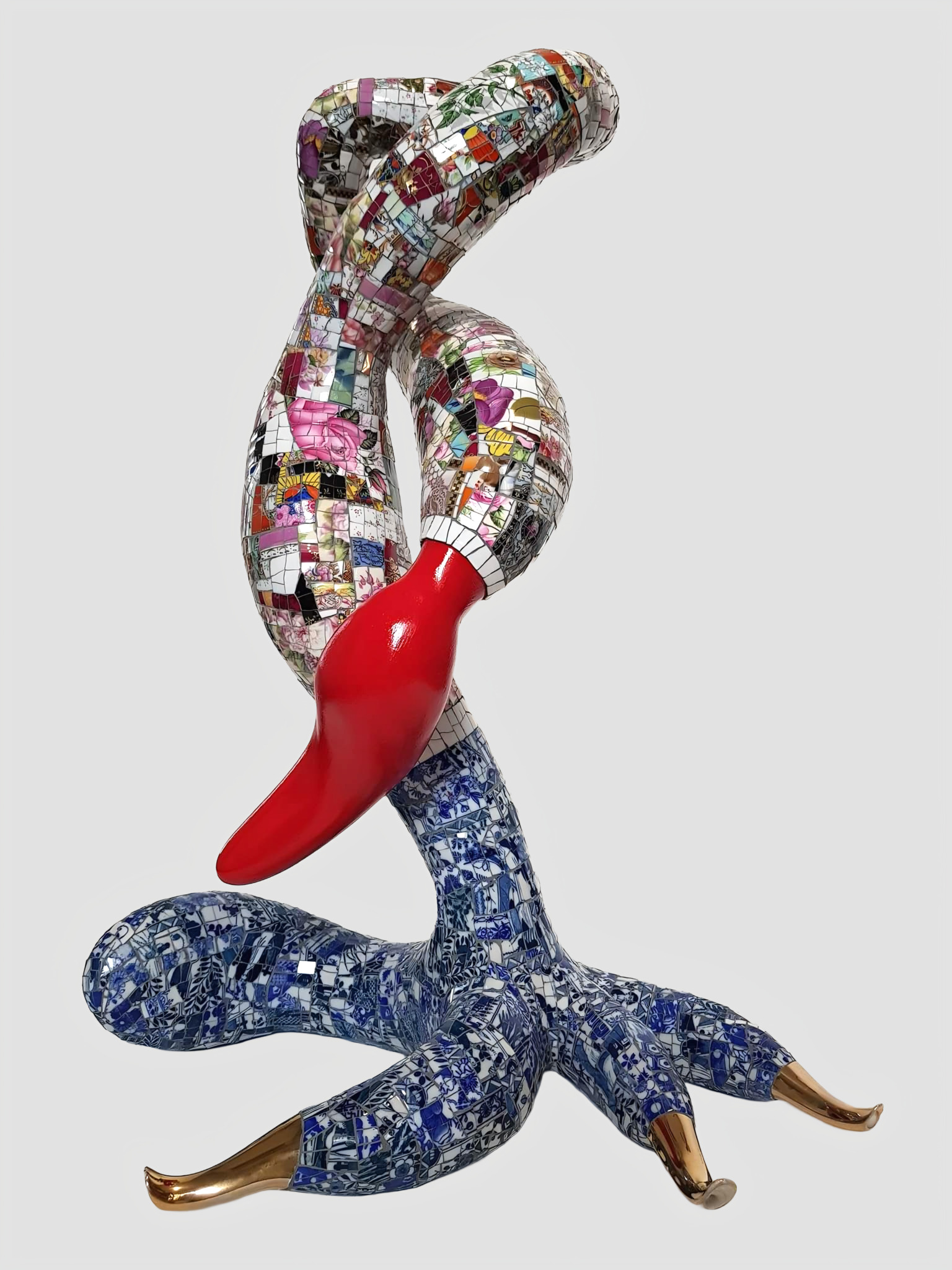 Opnieuw een porselein sculptuur met een ROOD accent en als extra heb ik 3 goudkleurige porseleinen " nagels " toegevoegd. De onderkant is ook in z`n geheel beplakt met porselein. Deze sculptuur is net als alle andere sculpturen volledig met de hand gemaakt / UNICA en is NIET te koop.