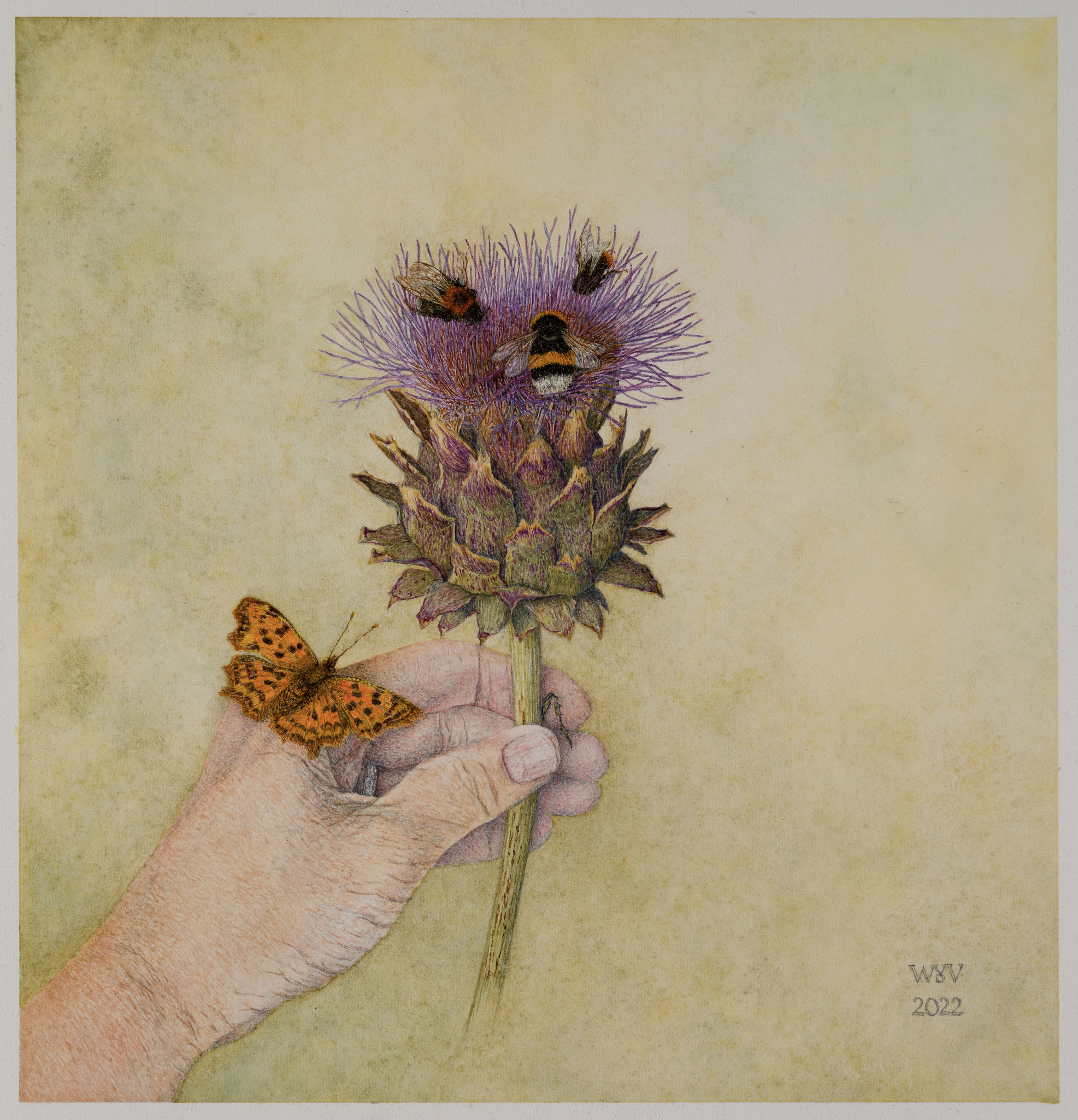 Hand Kardoen Bloem Paars Groen Mens Insect Bij Hommel Vlinder Aardhommel Akkerhommel Gehakkelde Aurelia Natuur Dier