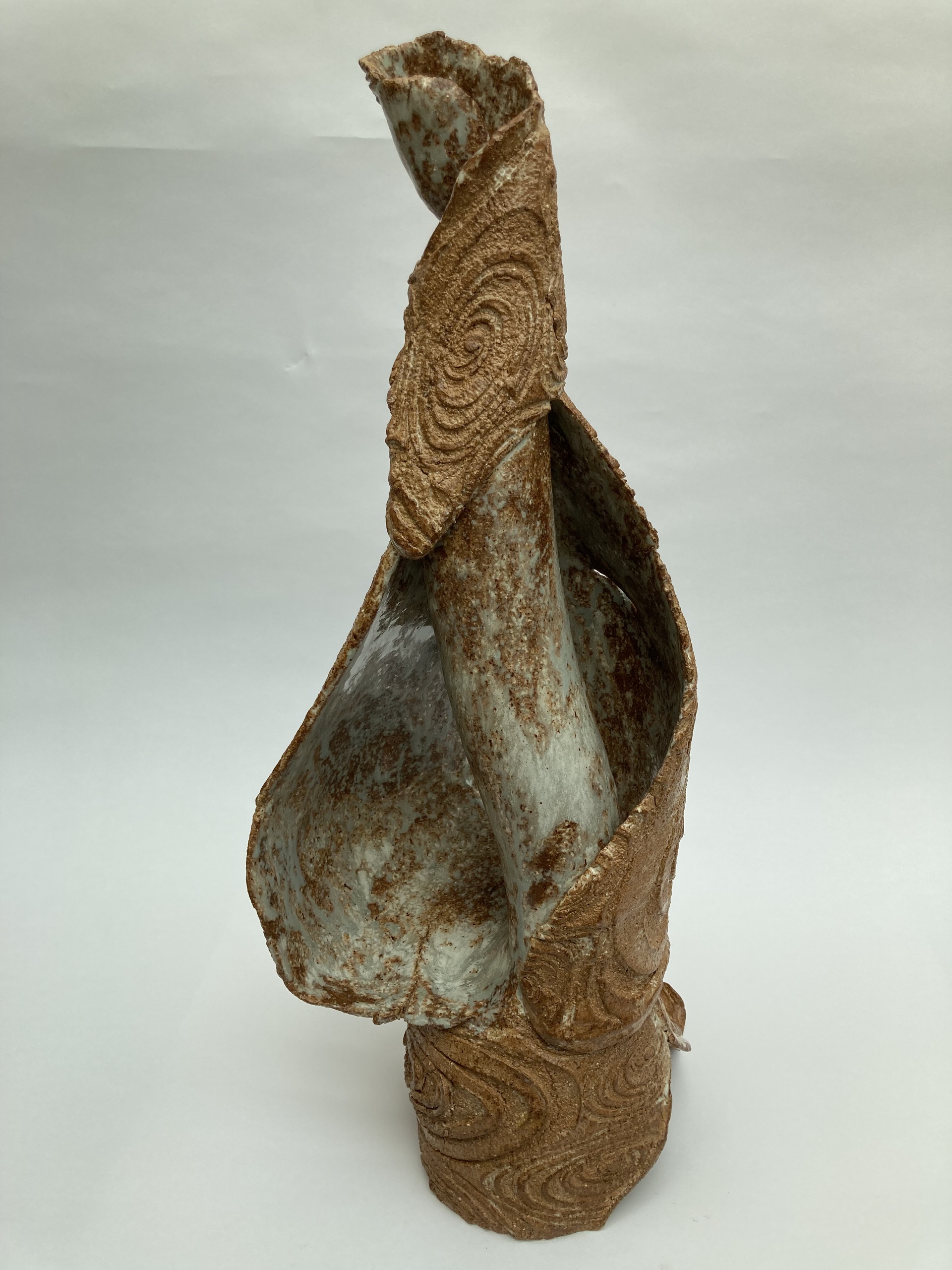 Geïnspireerd op een door de zee geërodeerde schelp. Gerecycled glazuren, steengoed, winterbestendig