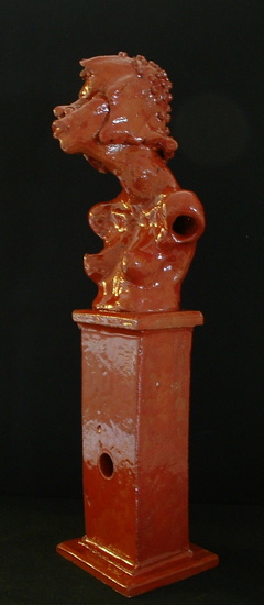 keramisch beeld, staand vrouwelijk naakt, halfbeeld, uitgeboetseerd, carmenkleurig geglazuurd,