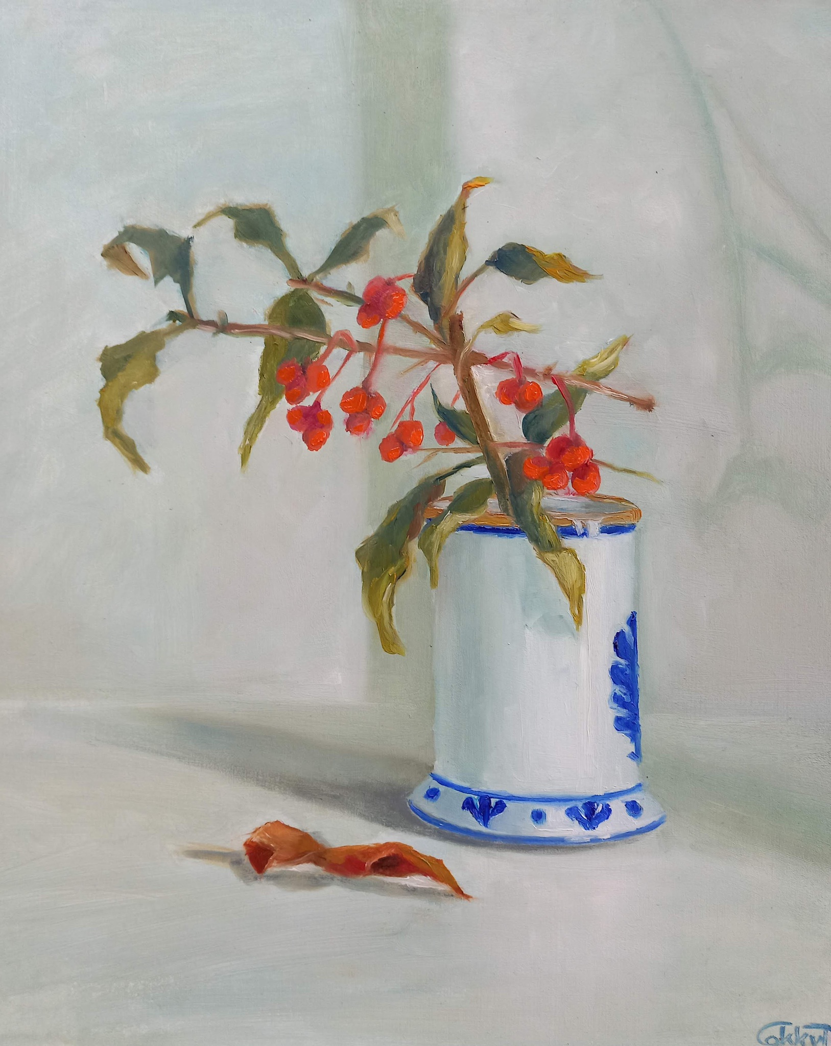 Figuratief Realistisch Olieverf Paneel Stilleven Delftsblauw Schaduwen Vaasje Besjes Blaadjes Takjes Kardinaalsmuts