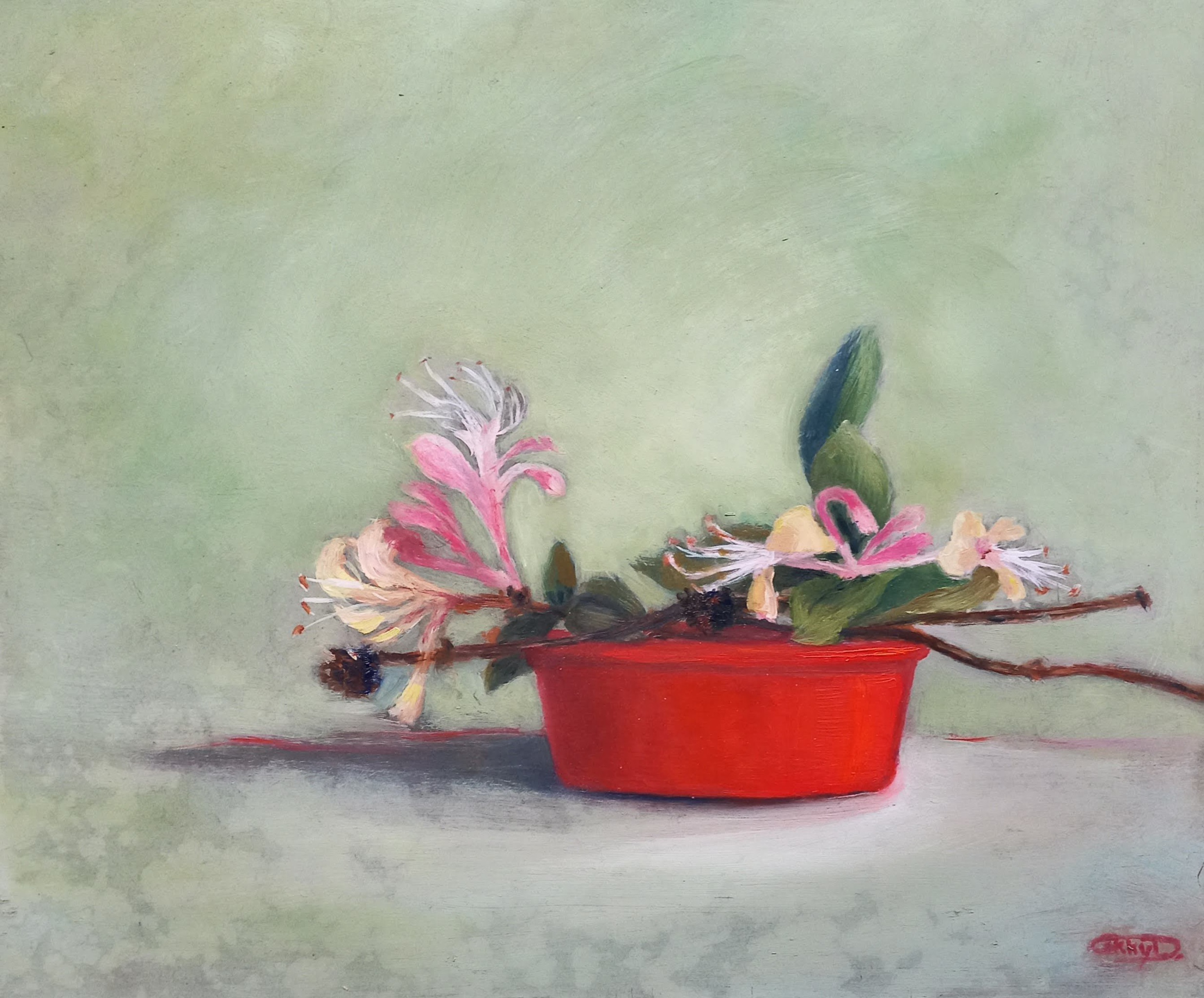 Figuratief Rood Realistisch Olieverf Paneel Stilleven Schaaltje Kamperfoelie Takjes Bloempjes