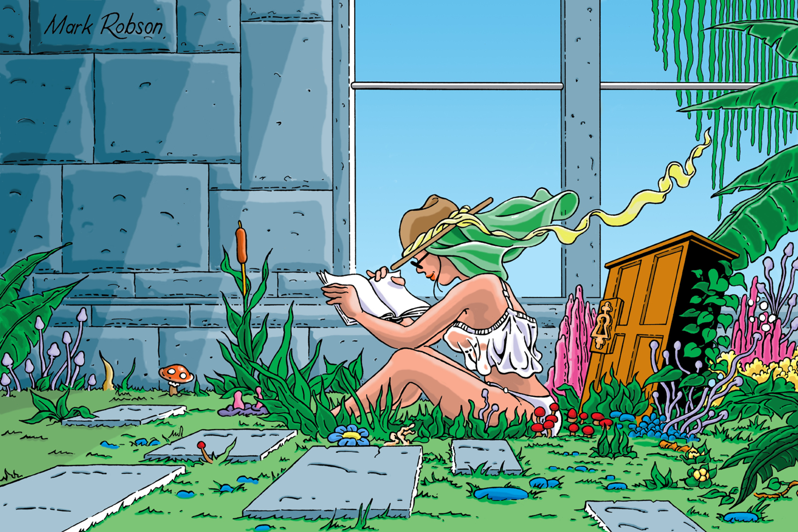 Bij een deel van mijn illustraties ben ik dikwijls al blij met de zwart/wit versie, maar deze smeekte wel al een hele tijd om kleur. Ergens wat geïnspireerd op, en een eerbetoon aan, het kunsthistorische wandtapijt "Mon Seul Désir", waarin de symboliek mogelijk de bevestiging van de vrije wil is. Je hebt geen groene vingers nodig om grondig van een goed boek te kunnen genieten, maar het helpt.