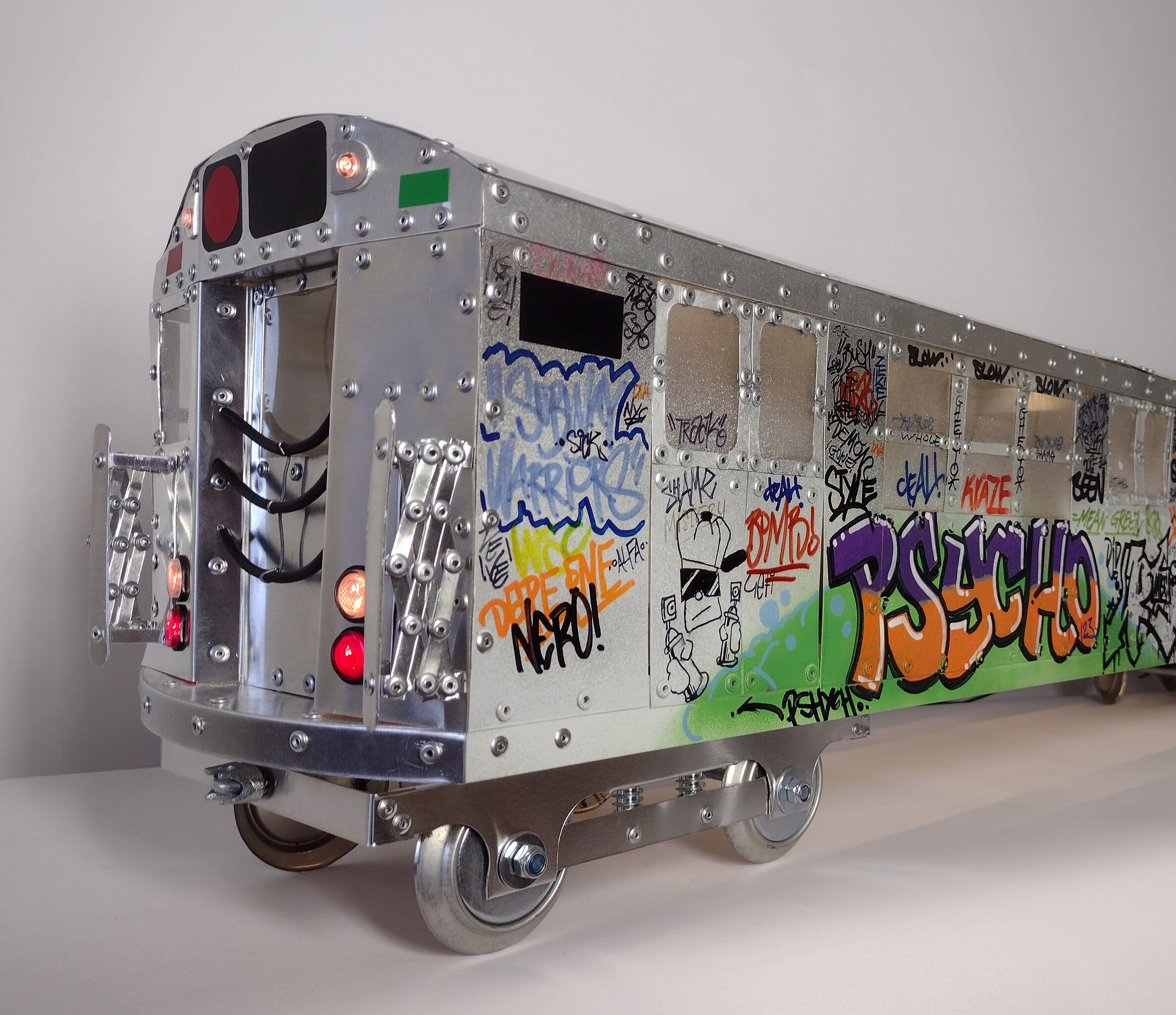 Jaren 80 New York metro trein. Gemaakt van aluminium, gepopnageld. Met binnen- en buitenverlichting. De wielen zijn gemaakt van frisdrankblikjes.