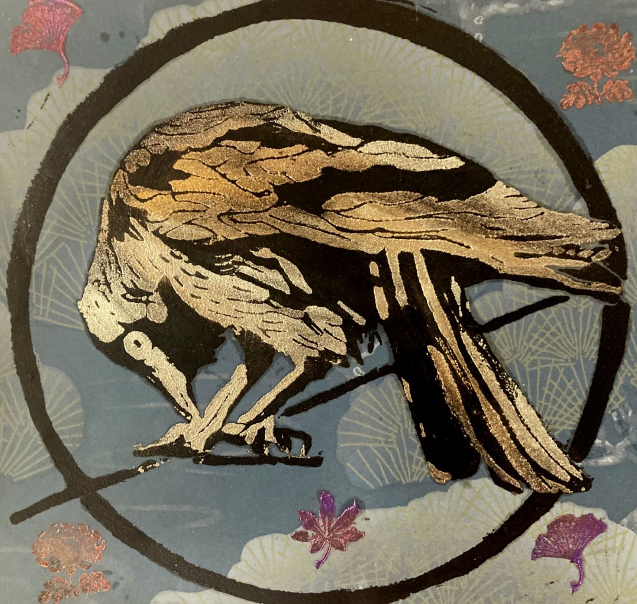 Kraai-achtige 12- Linoleum dubbeldrukken met etsinkt en Japanse stempels, bewerkt met metallic poeders op gedecoreerde ondergrond in houten wissellijst van 30 x 30 cm en gebroken wit passe partout. Handafdrukken.