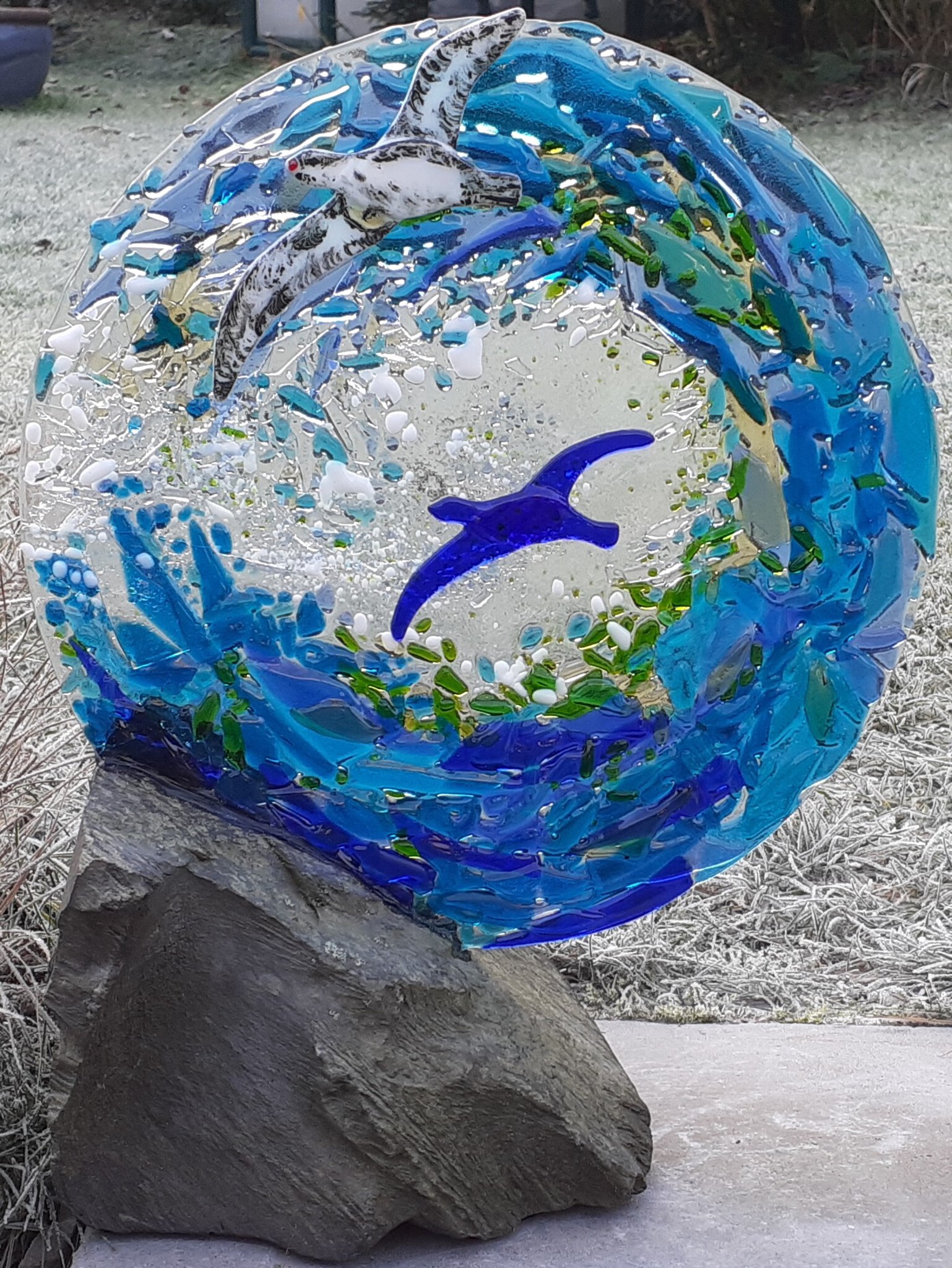 Geïnspireerd door de zee, zo mooi en toch zo ongetemd. Een versmolten glasgolf brengt alle kleuren samen die je op zee tegenkomt. Grote rollende golven brengen voedsel voor vogels in de buurt van de top van het water. De twee vogels zijn glasfusie met brand schilderij.