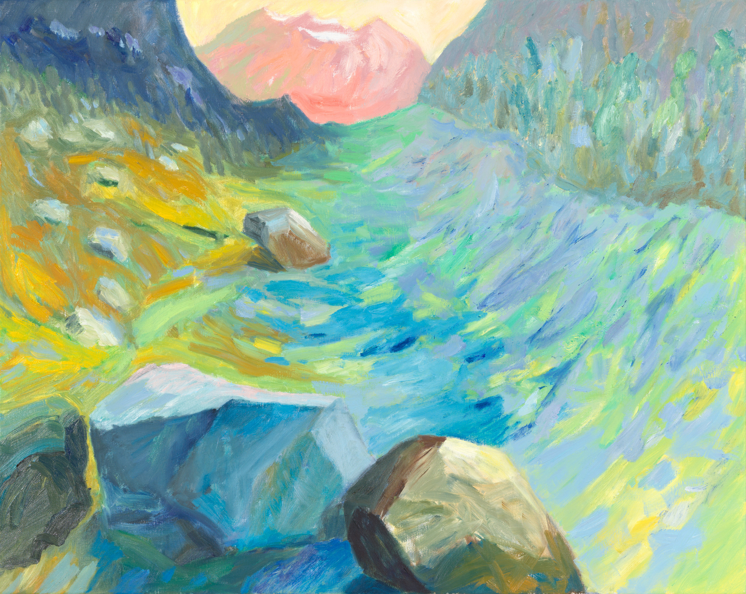 Sophie Bekkering toont in haar schilderijen en keramiek de grootse natuur. Begonnen vanuit wandelingen door de Gelderse bossen is ze inmiddels de bomen nagereisd tot aan en over de boomgrens. De ongerepte alpine ruimte waarin bomen, rotsen en water figureren.is haar speelveld.In haar schilderijen verbeeldt ze de onderliggende krachten van deze stille omgeving door middel van haar expressieve toetsen en levendige kleurcontrasten.