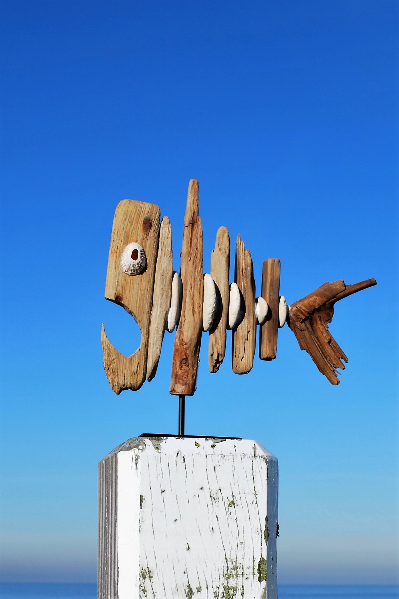maakt al jaren houten beelden door natuurlijke objecten uit zee te koppelen. De beelden zijn ruw en puur.