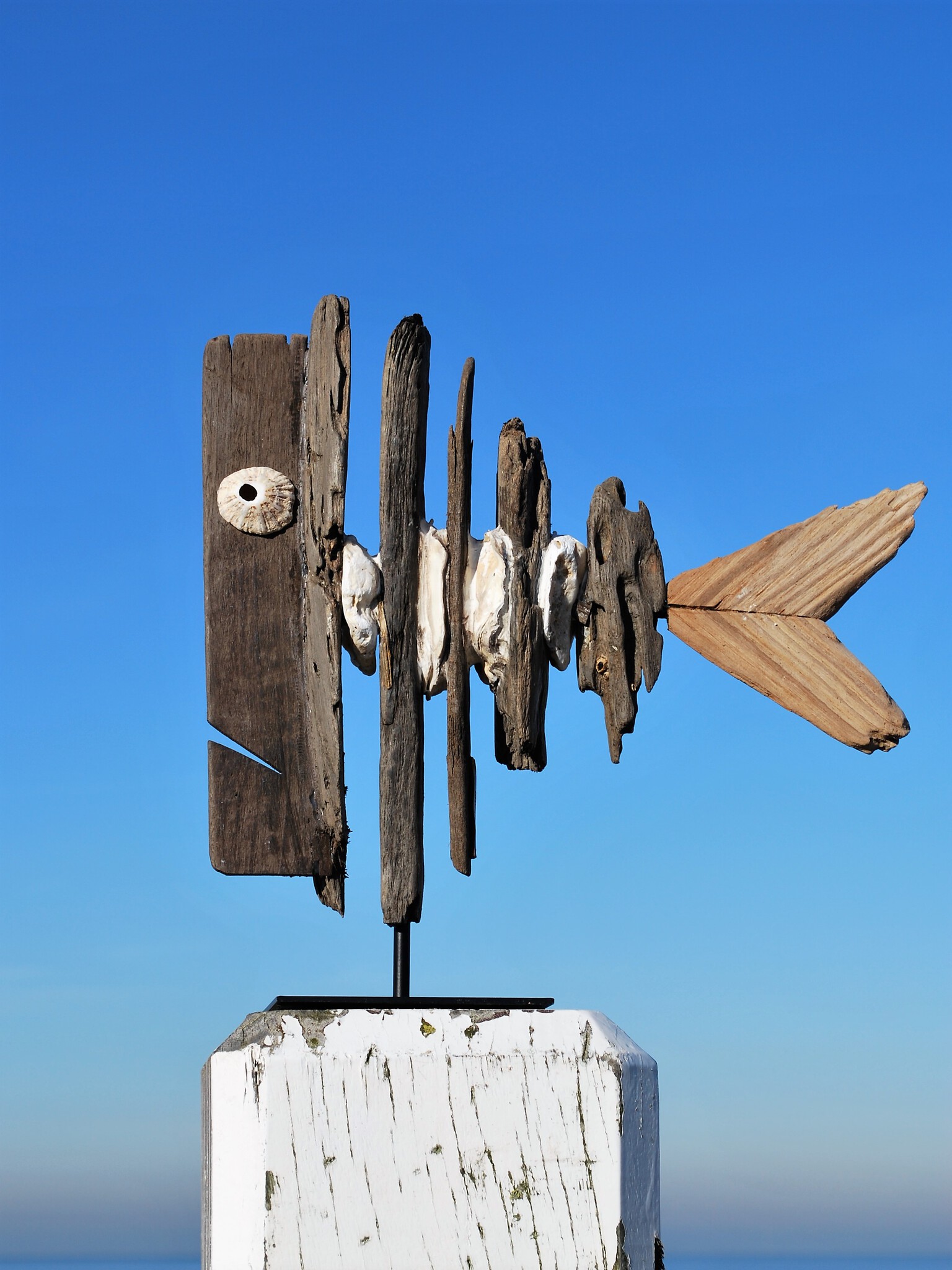 maakt al jaren houten beelden door natuurlijke objecten uit zee te koppelen. De beelden zijn ruw en puur.