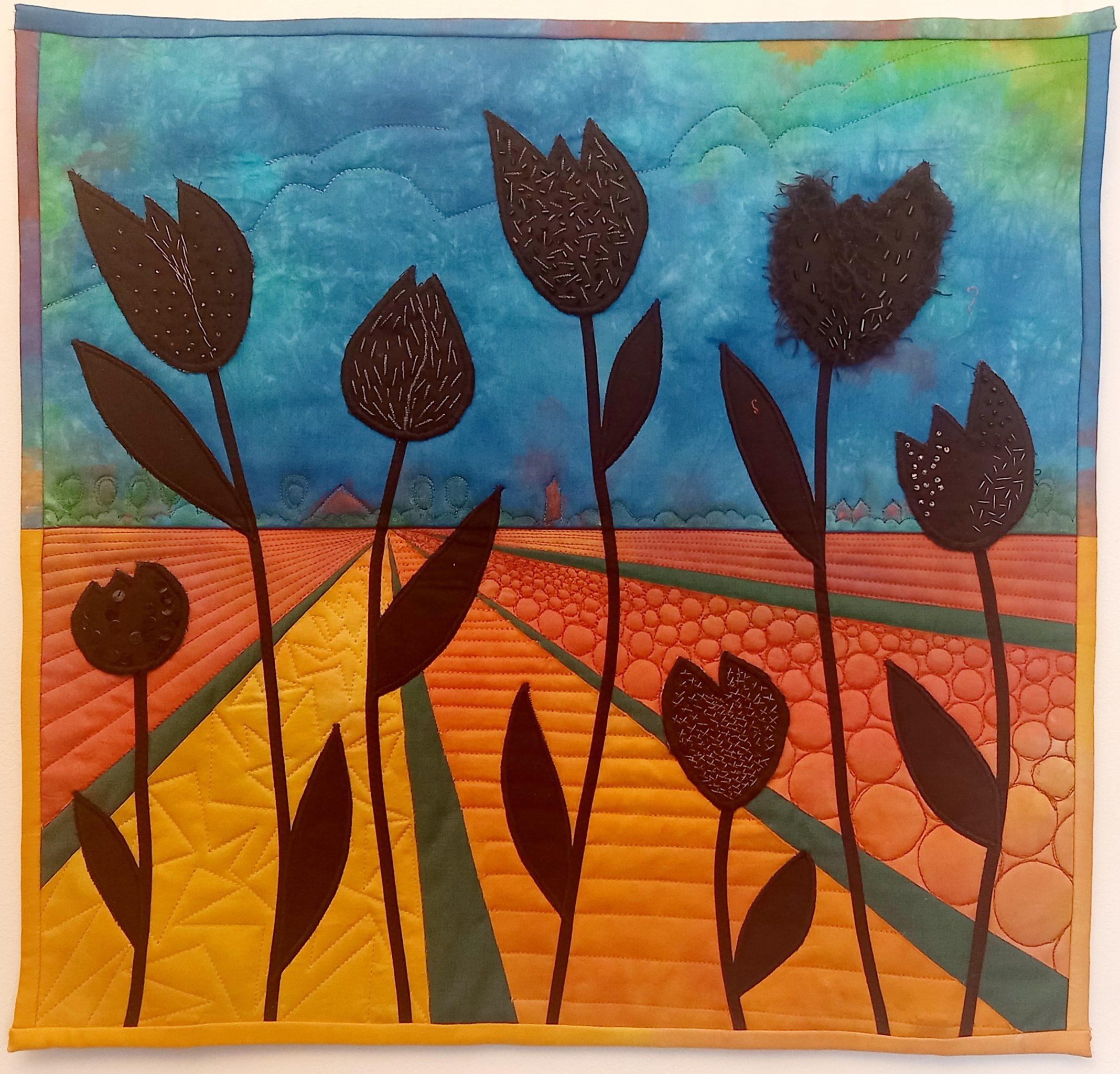 Landschapsquilt gemaakt n.a.v een expositie en wedstrijd, georganiseerd door museum "De Zwarte Tulp" uit Lisse. Machinaal gemaakt, de tulpen zijn met de hand bewerkt.