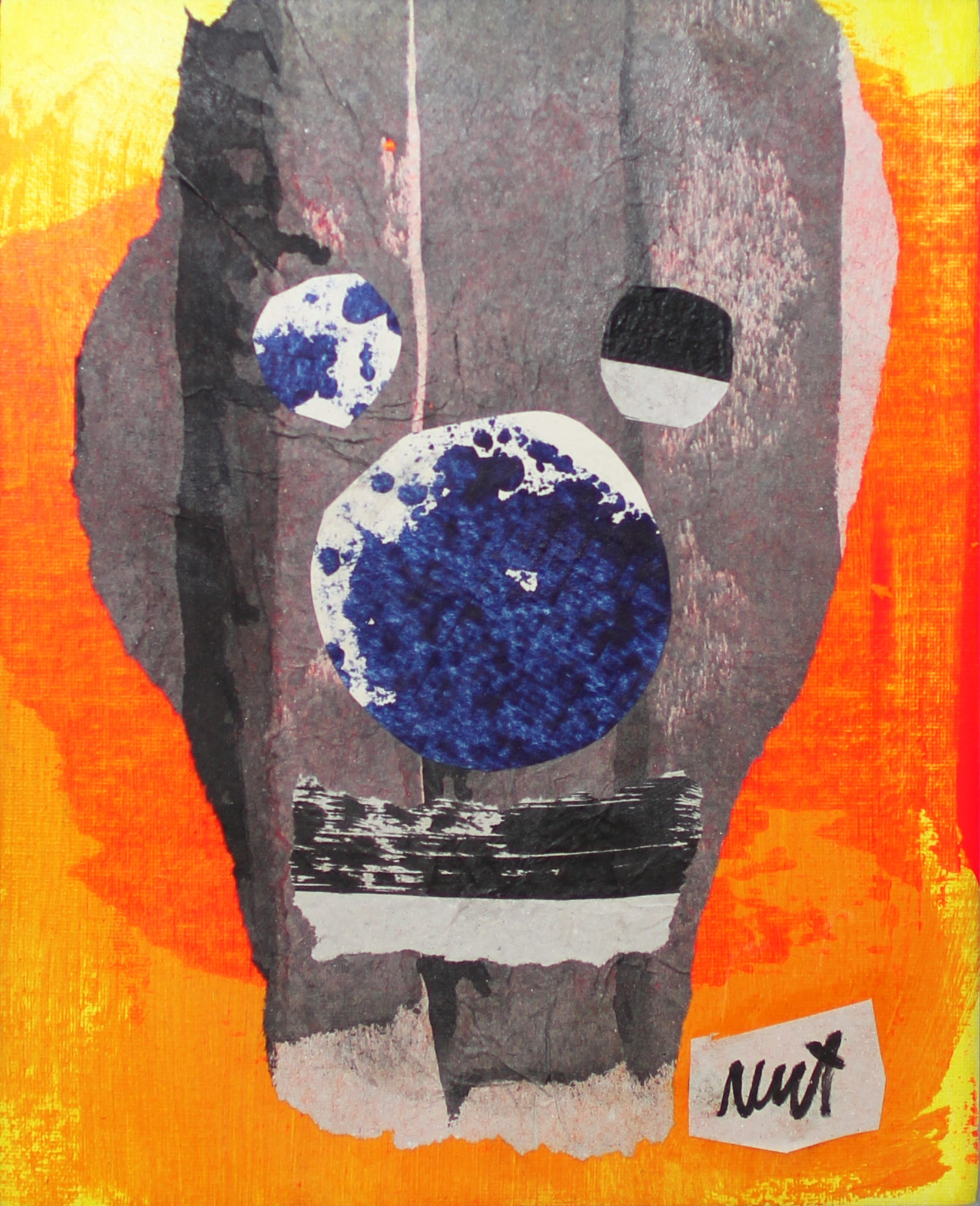 Mixed media portret van een clown Beschilderde papierknipsels of paneel. Acrylverf en inkt.