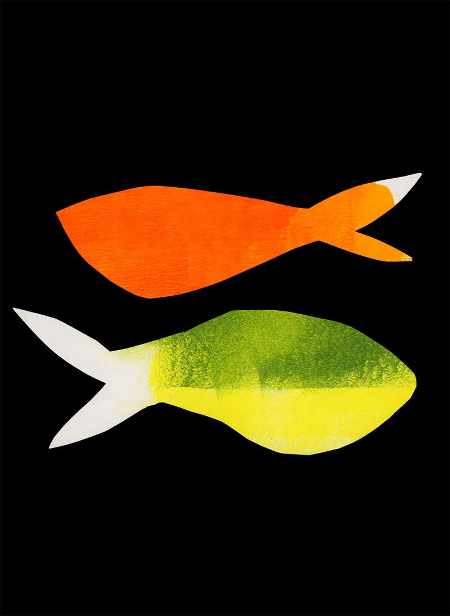 Fishes Behoort tot ingelijste serie: Fishes / Food / Popsicles Collage op zwart papier Acrylverf, Papier Zwarte alluminium lijst