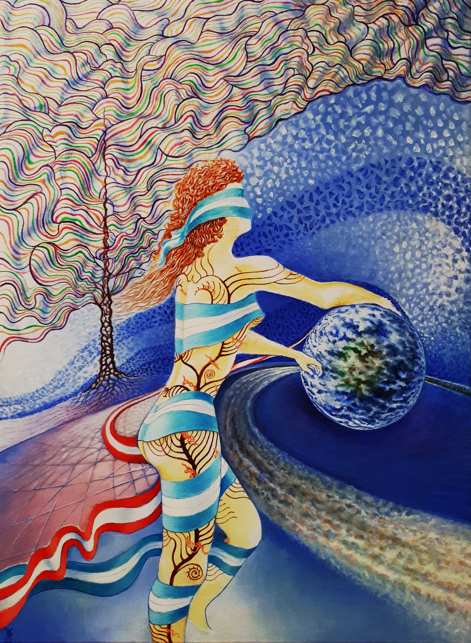 Weliswaar...je hoort hier vanzelf een mits en een maar..! De zorg van onze Moeder Aarde in haar tocht door de tijd, is hevig en vraagt grote inzet. De boom verbindt het aardse en het spirituele. De blauw-witte vaan verbeeldt positiviteit en de rood-witte de negativiteit. Elementen die ons allen aangaan!