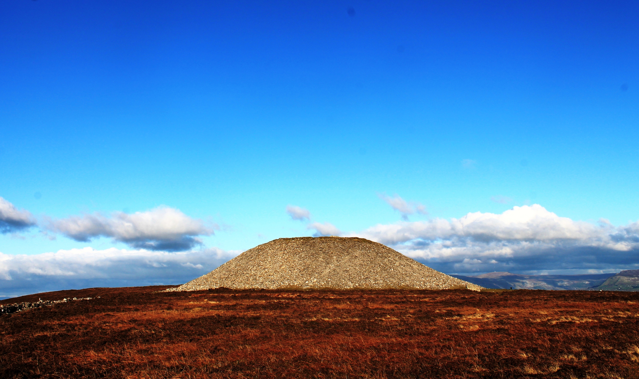 Queen Maeve's Grave (irish: Miosgán Meadhbha) is large passage tomb situated on the top of Knocknarea Mountain (327m), dominating the landscape of the Coolera peninsula in County Sligo. Legend says, that is the final resting place of Queen Maeve of Connacht, the ancient warrior queen. This Neolithic monument has approx 55 m in diameter, is 11 m high and was made of locally quarried limestone. There are also remains of smaller megaliths, as well as huts and large embanked area along the eastern slope. Formal excavations has never been carried out, but is thought the Queen Maeve's cairn and other remains may have been built around 3000 BC.