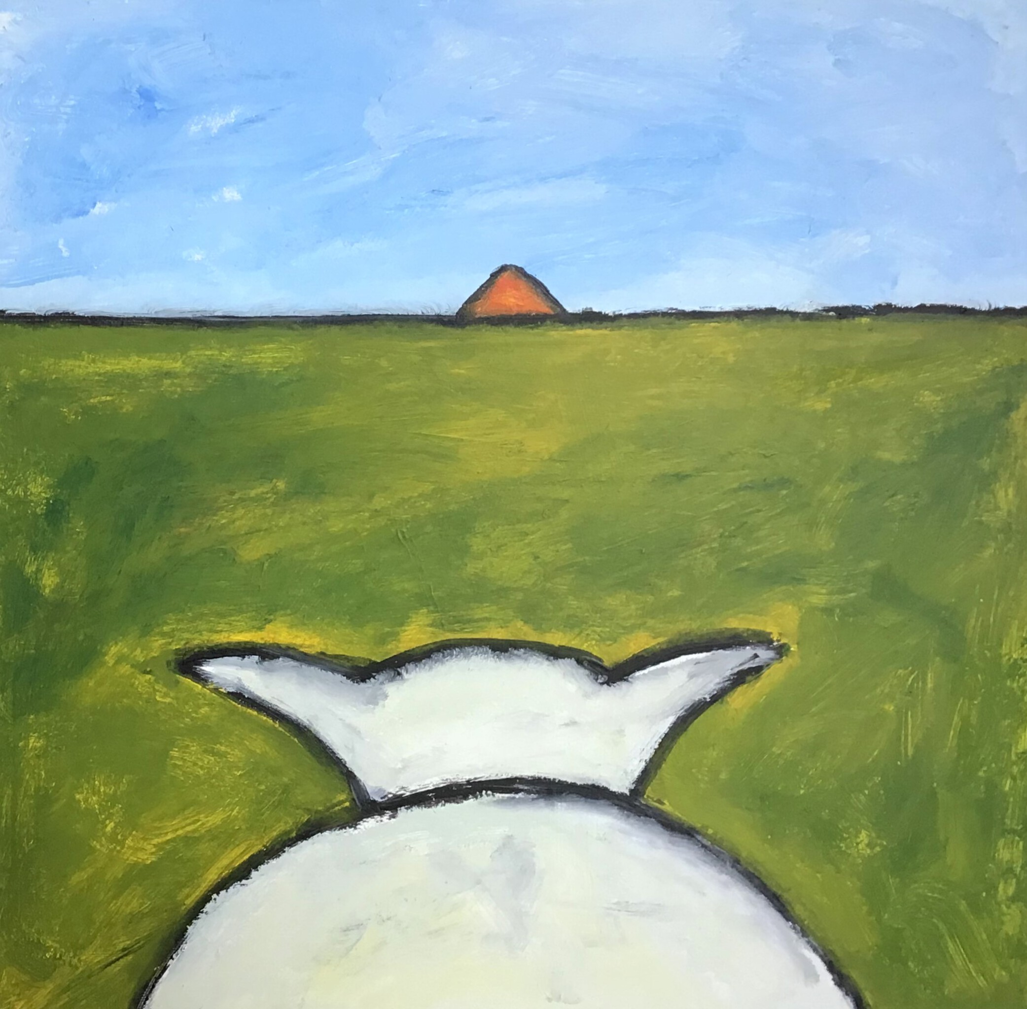 In de verte brandt er altijd een vuurtje. Texels werk met schaap en schapenboet. 82 x 82 cm.