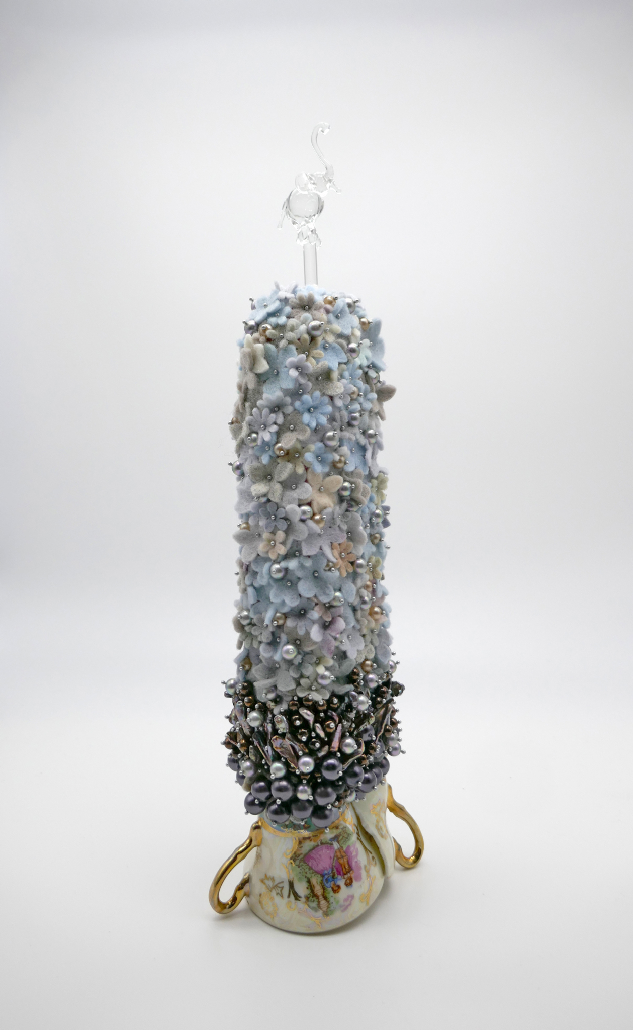 Deels handgeverfd wol vilt, keramiek, parels en kralen, spelden, foam.