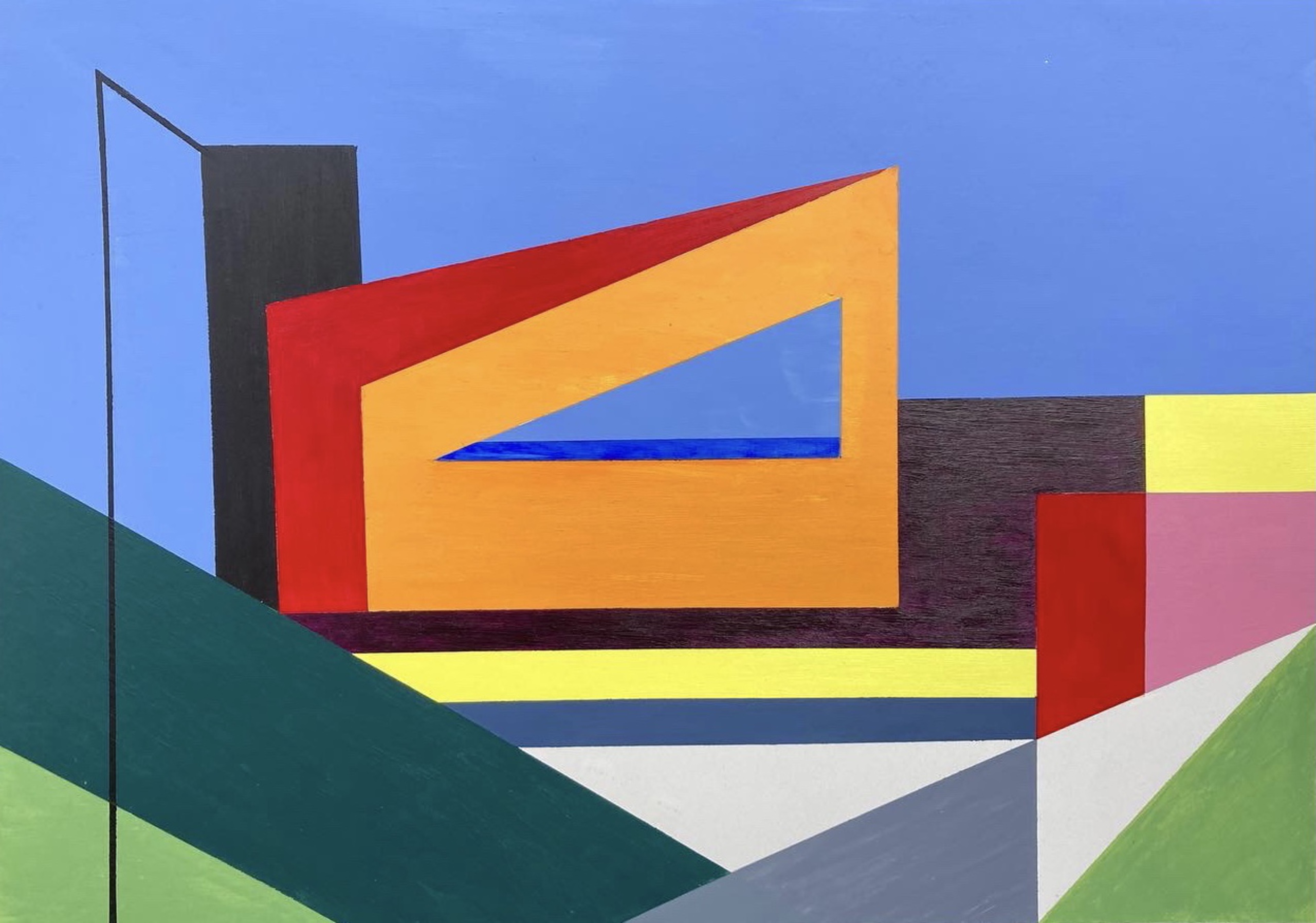 Puur intuïtief gewerkt met kleuren en lijnen. Uiteindelijk geeft het mij het gevoel strand huisjes en duinen. Het is maar net wat je er in ziet, dat kan voor iedereen anders zijn.