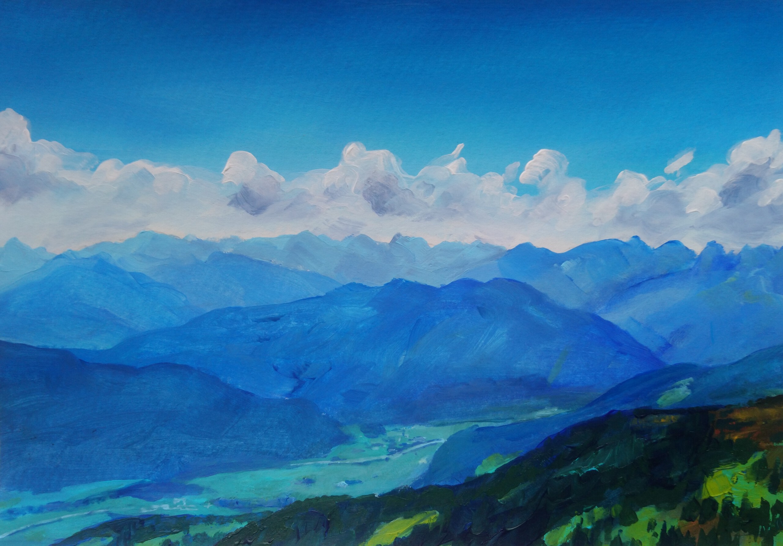 Bergen Schilderij Landschap Natuur Wolken Bomen Gras Berglandschap