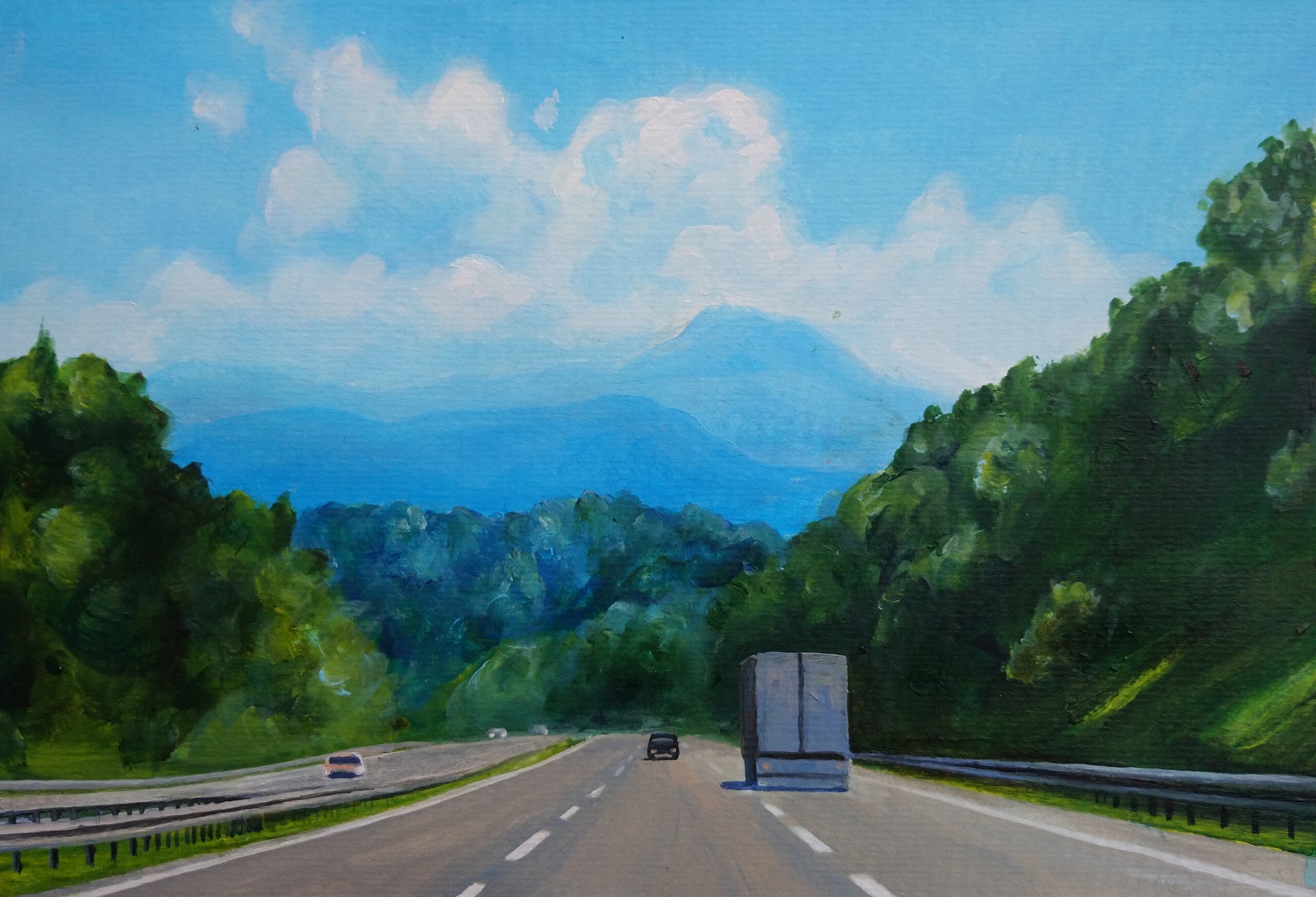 Weg Snelweg Bergen Bomen Wolken Zon Schilderij
