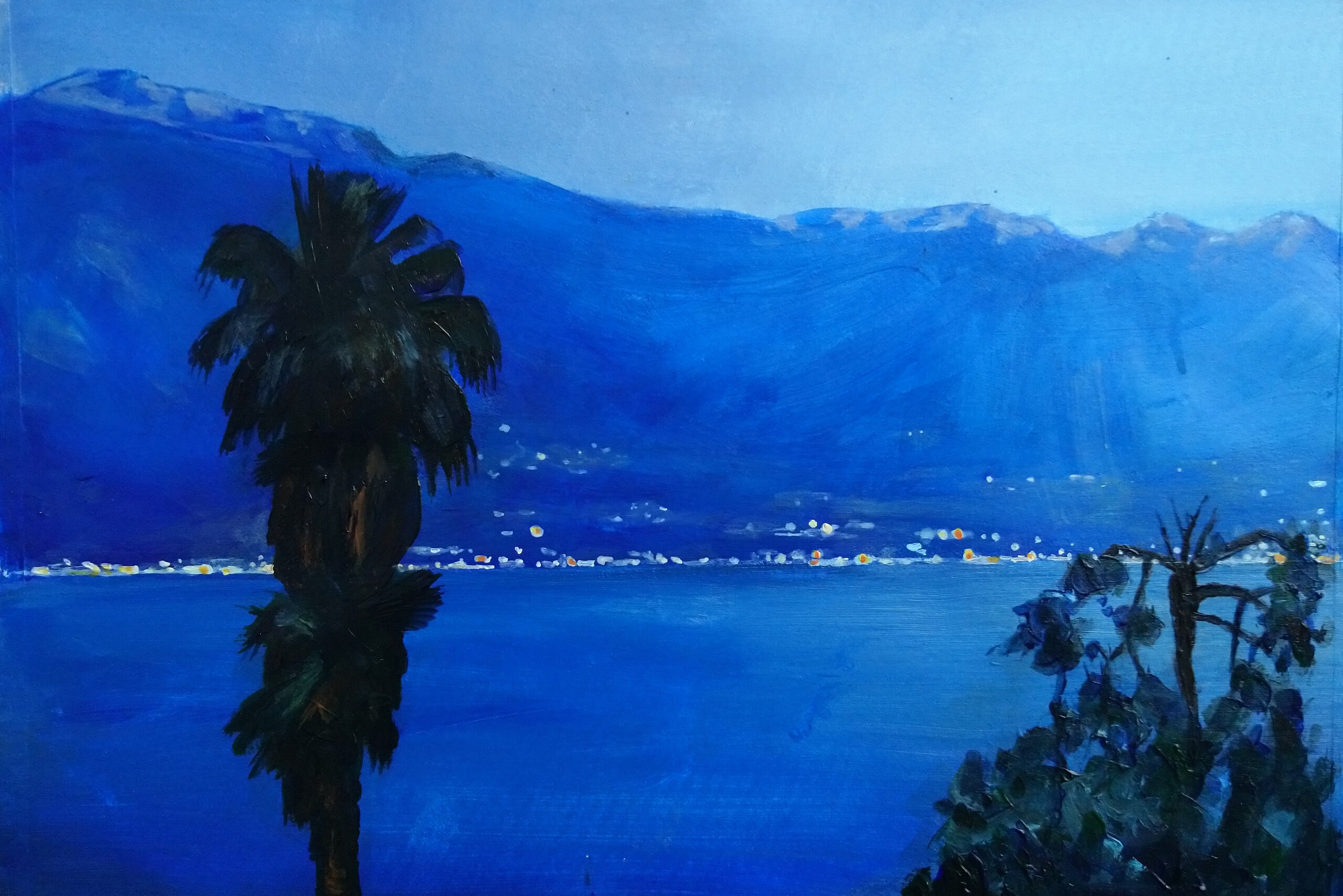 Schilderij Meer Bergen Avond Schemering Verlichting Palmboom