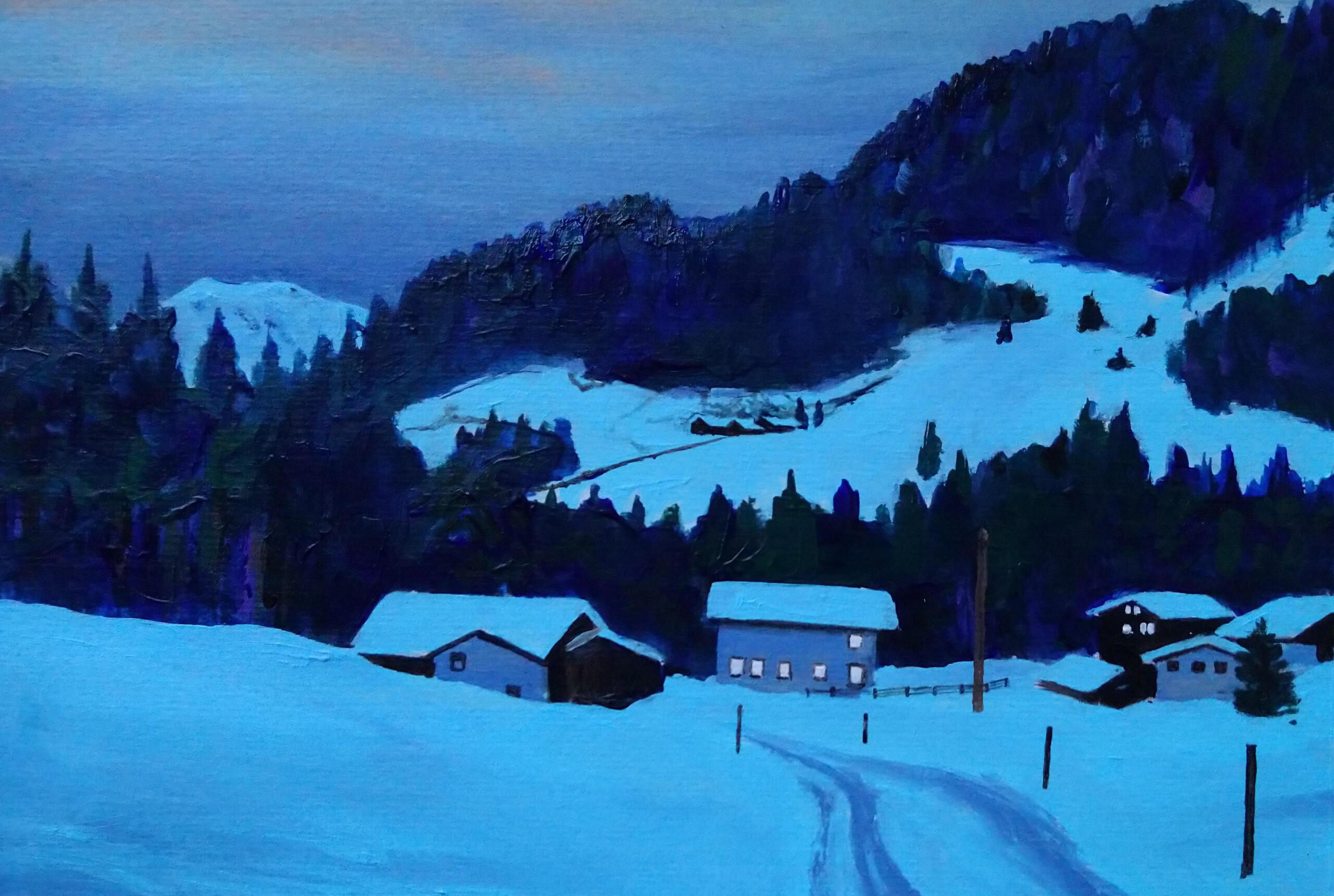 Schilderij Winter Winterlandschap Bomen Huizen Sneeuw Sneeuwlandschap Schemering Licht Lucht Berglandschap Bergen