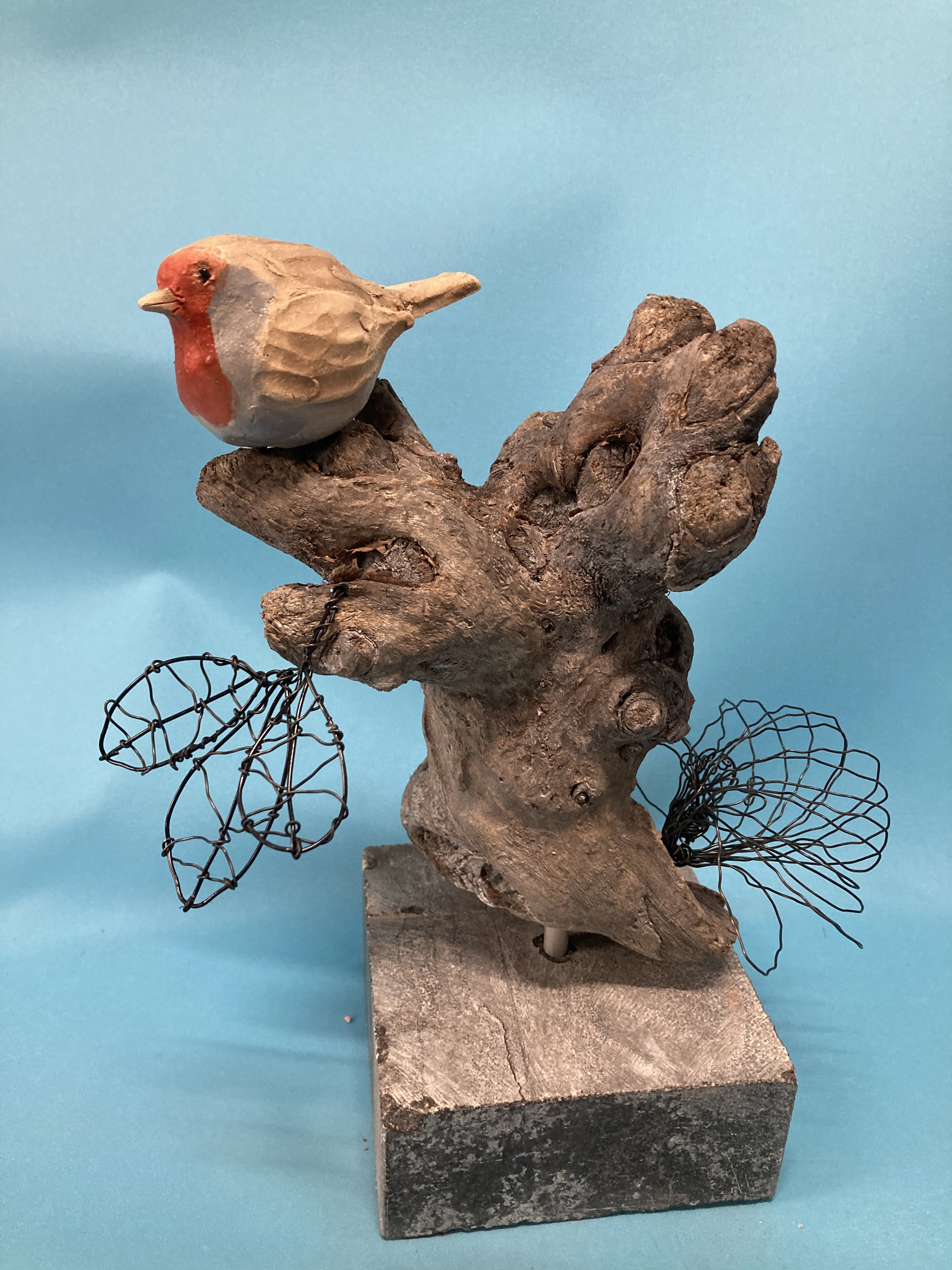 Roodborstje 1. Vogeltje op stukje druivenhout. De sokkel is van natuursteen.